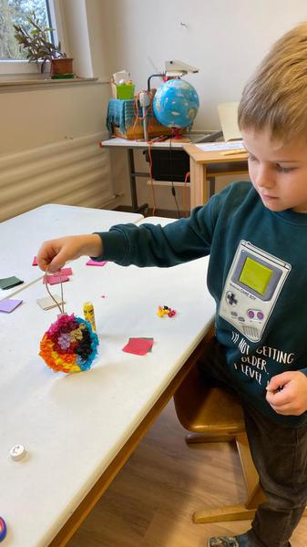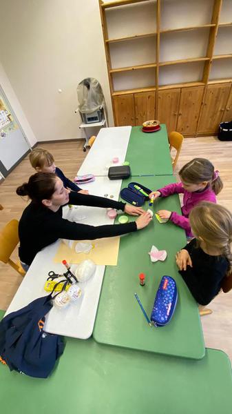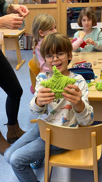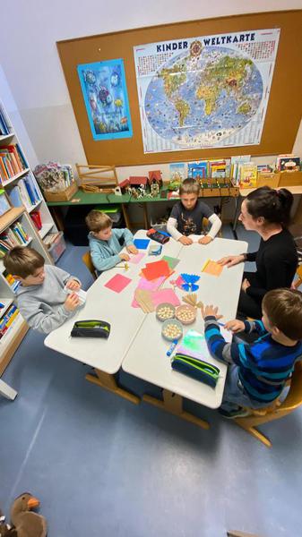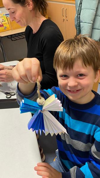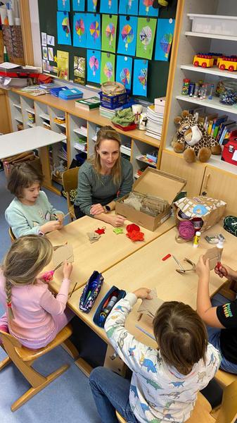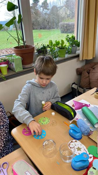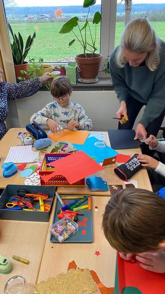 Einen kreativen und intensiven Schultag erlebten die Kinder der 1b am Freitag, 28. November. Fünf Mütter waren dankenswerterweise ins Klassenzimmer gekommen, um zusammen mit den Schülerinnen und Schülern sehenswerte Deko-Artikel fürs Schulhaus und Schmuck für den Weihnachtsbaum zu basteln. An fünf Stationen arbeiteten die Kinder konzentriert und hatten jede Menge Spaß. Die Ergebnisse können sich in wahrsten Sinn des Wortes sehen lassen: Das Großlangheimer Schulhaus erstrahlt jetzt dank Weihnachtskugeln aus Knüllpapier, Papierengeln aus Muffinpapier, unterschiedliche Hänge-Mobile oder Wollsterne und vielem mehr in adventlichem Glanz.