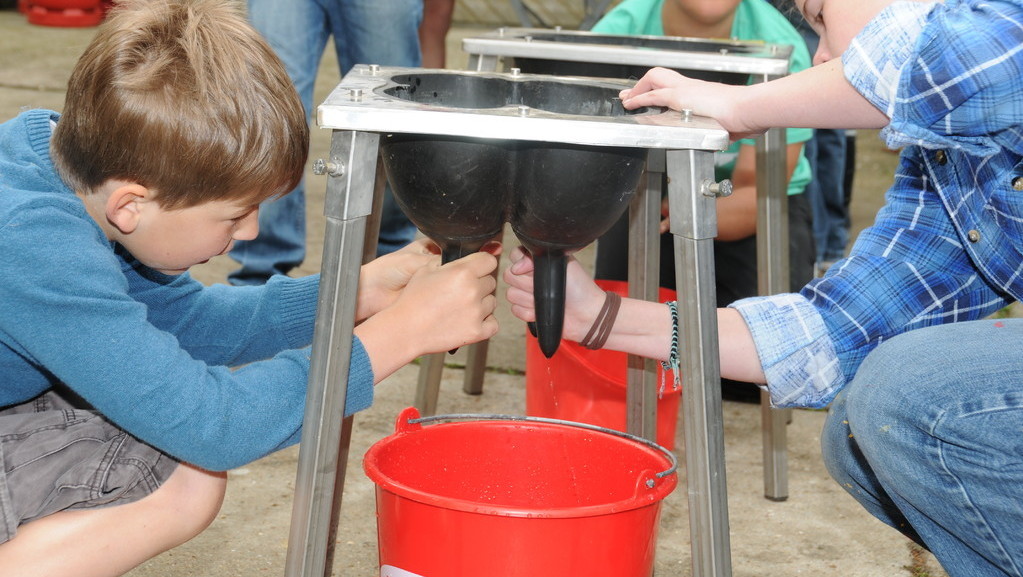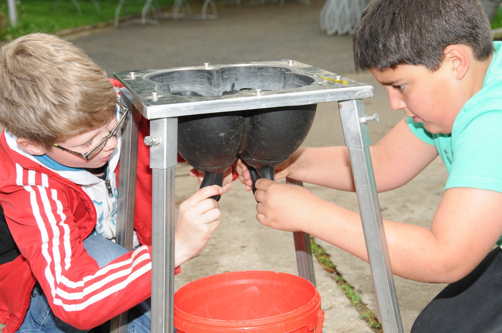 An der zweiten Station übten wir das richtige Melken an einem Metallgestell mit Gummieuter. Nicht allen fiel das leicht, doch Emil konnte es richtig gut.