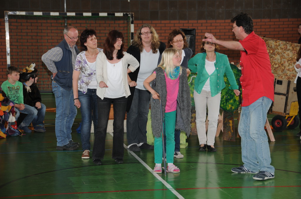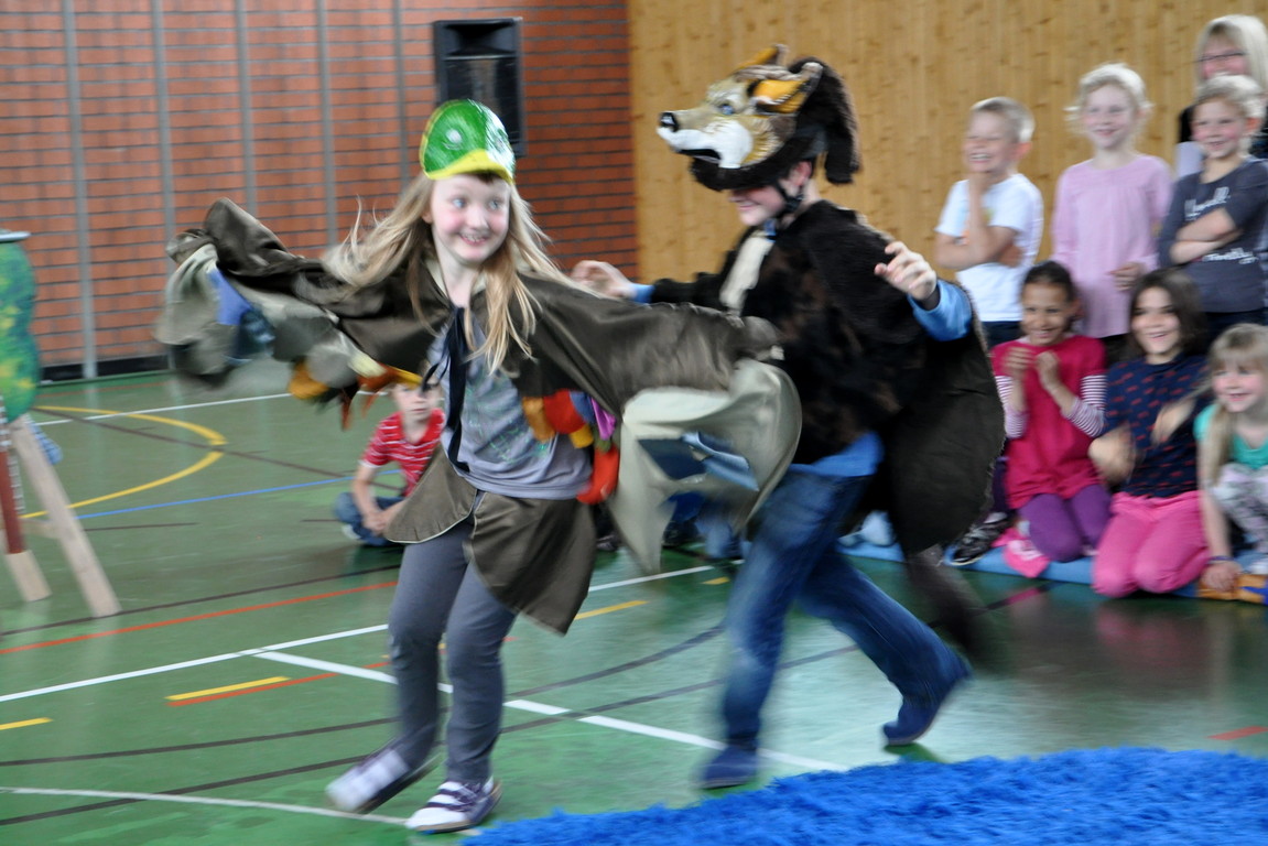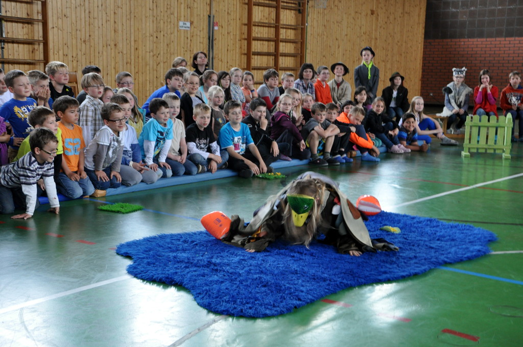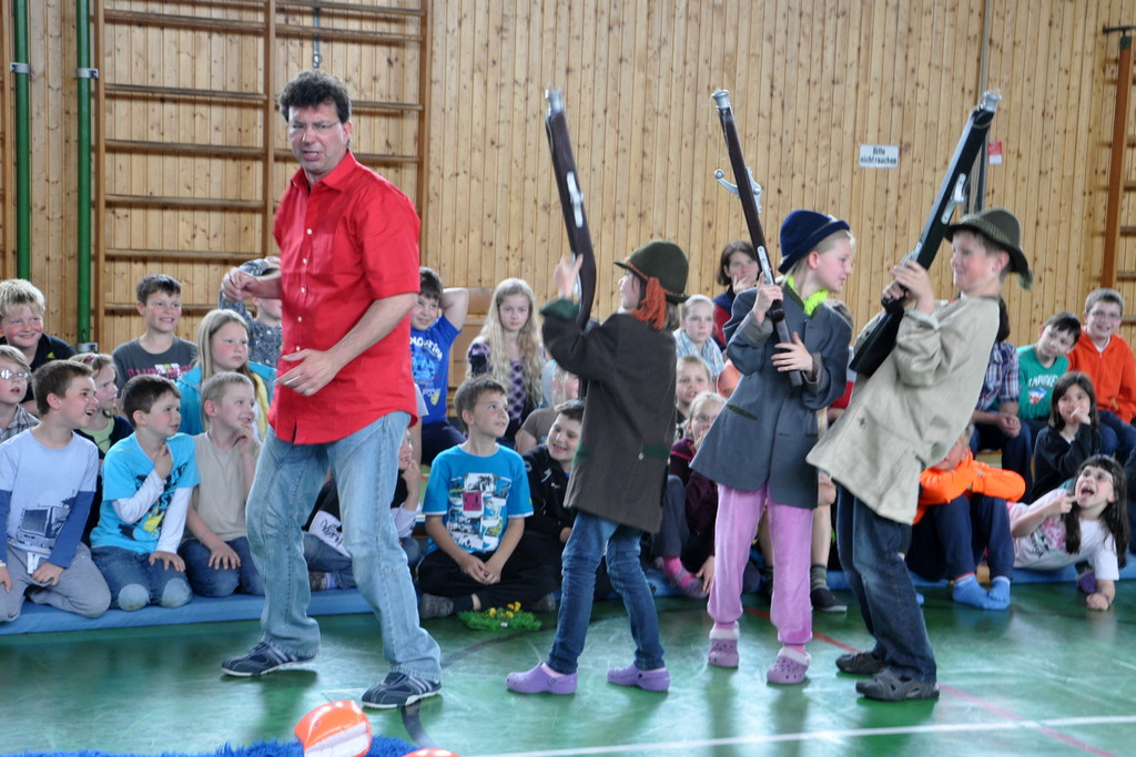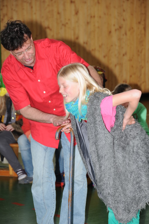 zeigen. Eifrig waren auch die Zuschauer bei der Sache, als die erwachsenen Schauspieler mit Spaß und komödiantischem Talent durch das Stück moderierten und Fragen dazu stellten.