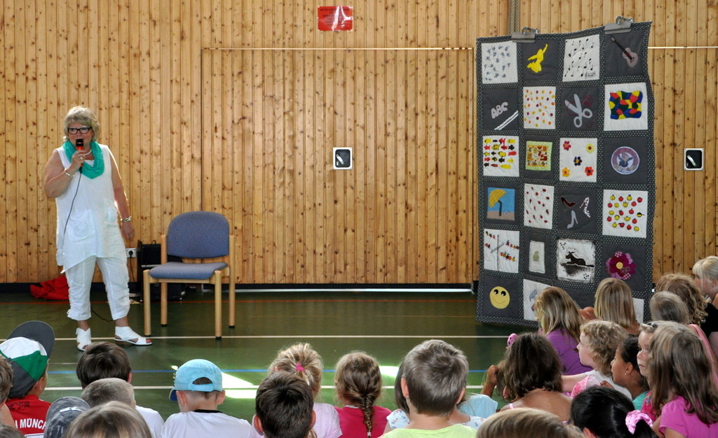 Frau Emmert sollte sich zunächst für den Ruhestand bewähren, indem sie verschiedene Aufgaben lösen sollte, die mit ihrem Unterricht zu tun hatten. Dazu wurde gemalt, von den Kindern pantomimisch dargestellt oder von ihr im Fühlsäckchen ertastet. Besonders schwierig war ein Memory-Spiel, bei dem Frau Emmert verschiedene Bastelarbeiten den richtigen Schülern zuordnen musste. Dazwischen wurden fleißig selbst getextete Lieder gesungen. Am Ende überreichten ihr alle Kindern Blumen. Das Geschenk der Schulfamilie beeindruckte Frau Emmert besonders, denn alle hatten gemeinsam an einer tollen Patchworkdecke mitgewirkt, die sie sicherlich noch lange an die schöne Zeit hier in Kleinlangheim erinnern wird.