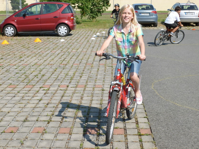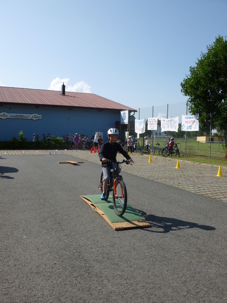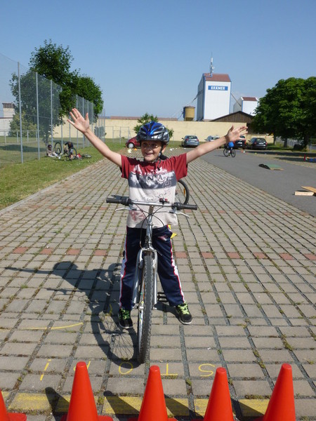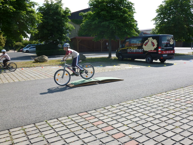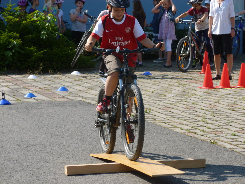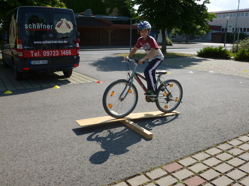 Bei scharfen Links- oder Rechtswendungen galt es das Gleichgewicht zu halten und das Fahrrad sicher durch die gemalte acht, oder um die Hütchen zu steuern. Bei anspruchsvollen Übungen, wie dem Fahren über eine Wippe oder auch über zwei aneinandergestellte Sprungbretter, konnten die Kinder ihren Mut beweisen und damit gleich ein Fahrsicherheitstraining absolvieren.
