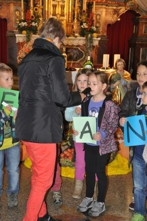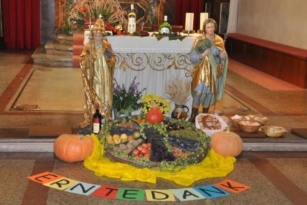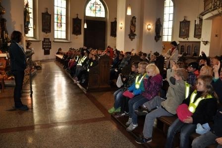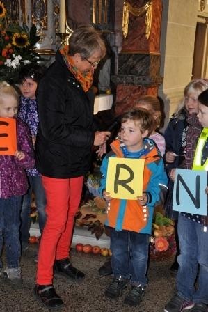 katholischen Kirche in Großlangheim. Sie waren mit ihren Religions-lehrerinnen und Frau Achter in die Kirche gekommen, um Erntedank zu feiern und die vielen Gaben zu bestaunen, mit denen