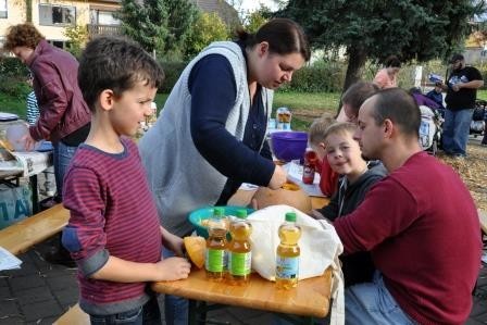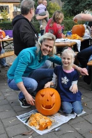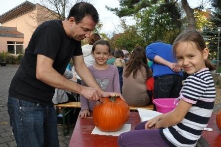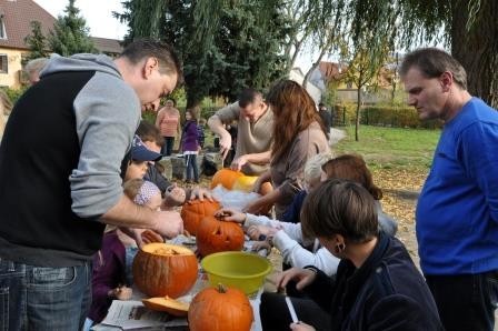 Bei herrlichem Sonnenschein trafen sich die Familien unserer Erstklässler am ersten Herbstferiensamstag mit ihrer Lehrerin Kerstin Schiersch auf dem Schulhof in Großlangheim. Da die Kinder aus drei verschiedenen Kindergärten kommen, bot sich damit nun auch die Gelegenheit für die Eltern, sich gegenseitig etwas näher kennen zu lernen. Gemeinsam wurden Kürbisse ausgehöhlt, gespielt, geredet und gelacht. Abschließend ließen sich alle das vom Klassenelternsprecher Herr Adrian Barthel organisierte und von den Eltern mitgebrachte Buffet schmecken. Es war ein rundum gelungener Nachmittag.