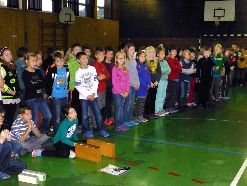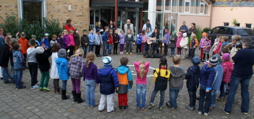 Der inhaltliche Teil endete in einem großen Kreis auf dem Pausenhof, wobei das neue Traubenlied unter Begleitung von Frau Achter lautstark gesungen wurde.