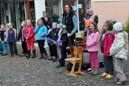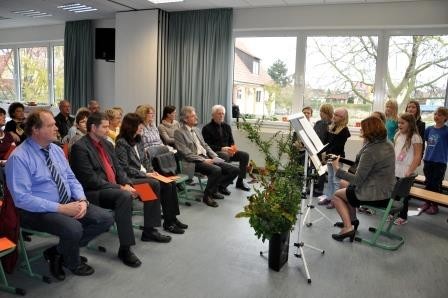 Mit dem selbst verfassten Lied: „Wie schön, dass Sie Rektorin sind!“ überraschte der Großlangheimer Kinderchor unter der Leitung von Frau Petra Sterk nicht nur die neue Schulleiterin. Auch Frau Sabine Henke schmückte mit der Flötengruppe der Schule das Programm musikalisch aus.