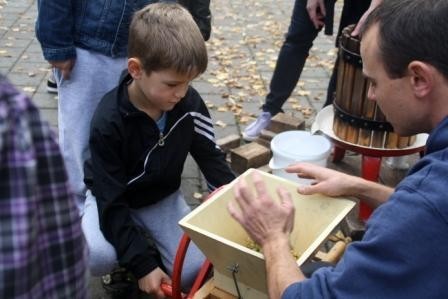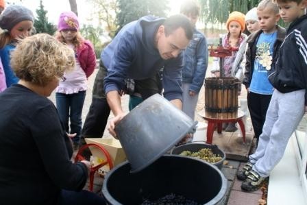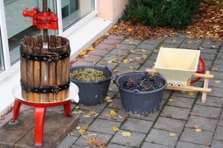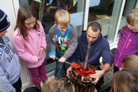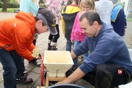 Bei Frau Büttner und Herrn Gebert wurden die frischen Trauben mit einer Handkelter und viel Körperkraft zu frischem Saft gepresst.