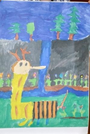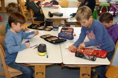 Da im Atrium des Schulgebäudes in Kürze ein Teich entstehen soll, malten die Kinder Bilder von ihrem Wunsch-Garten. Die