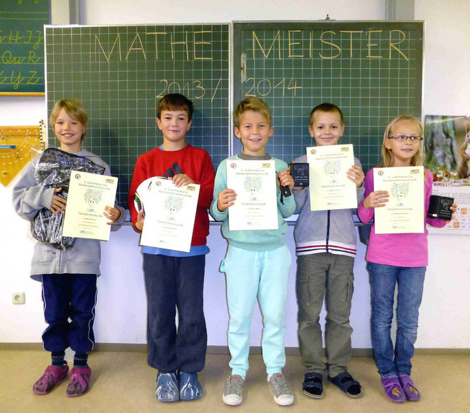 Am Freitag versammelten sich alle Viertklässler in der Turnhalle, um die Sieger der ersten Runde der Mathematikmeisterschaft 2013 zu feiern. Nicole Achter begrüßte alle Anwesenden und Lothar Müßig, Konrektor der Wiesentheider Nikolaus-Fey-Mittelschule, zeigte sich erfreut, dass so viele Viertklässler der Kleinlangheimer und Wiesentheider Schule sich den kniffeligen Aufgaben gestellt hatten. Herr Pfannes von der VR Bank Kitzinger Land und Herr Linnerth von der VR Bank Volkach-Wiesentheid überreichten den jeweils besten Jungen und Mädchen aus beiden Schulen einen Preis und wünschten ihnen für die zweite Runde, die am 12. November in der Wiesentheider Schule stattfindet, viel Erfolg.