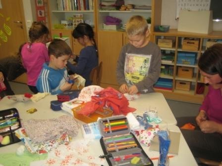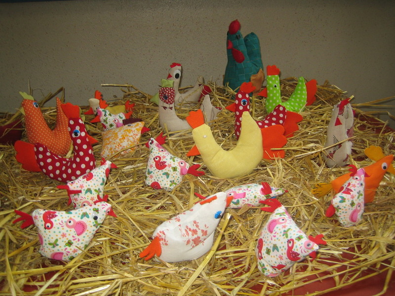 Schüler der Klasse 2b nähten mit Unterstützung von Müttern und Tanten eine bunte Hühnerschar. Die Auswahl der Stoffe bereitete den Schülern Spaß, dann wurde der Schnitt aufgelegt. Bald konnten die gewünschten Exemplare von den Erwachsenen auf der Nähmaschine angefertigt werden. Das Stopfen mit Sand und Watte bereitete allen Schülern Spaß. Schnell noch ein paar Augen und ab ins „Strohnest“ in der Pausenhalle.
