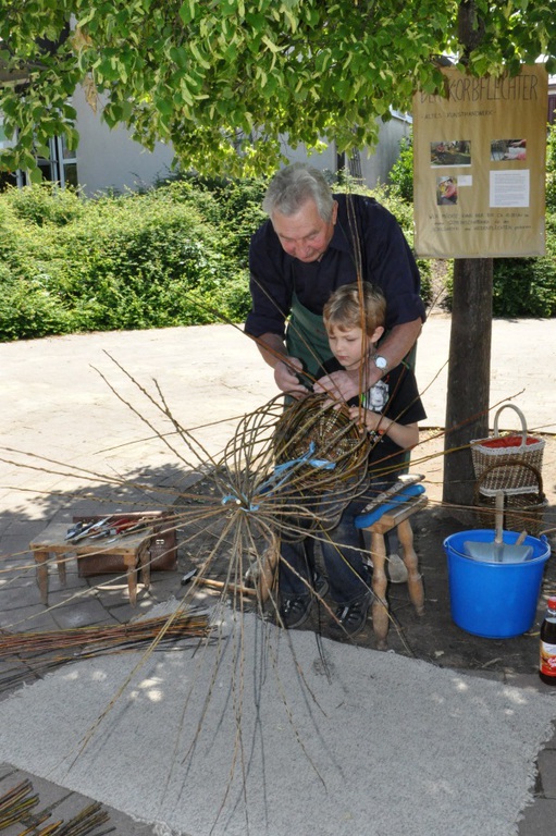 Handwerklich Begabte konnten unter fachlicher Anleitung von Herrn Schmitz Insektenhotels bauen , bei Herrn Schönberger und Martina Scherm Körbe flechten und mit Sabine Wenner Steine klopfen.