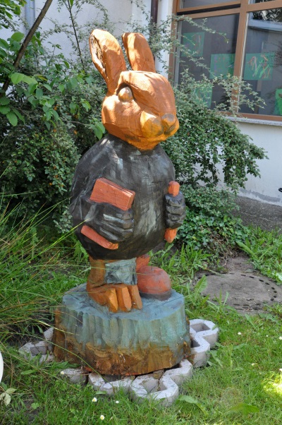 Schon im Vorfeld hatte Frau Anja Schwarz mit den Dritt- und Viertklässlern das Schullogo in eine lebensgroße Holzskulptur umgesetzt.