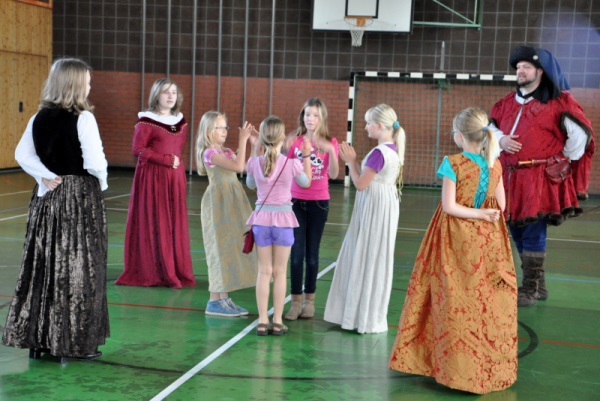 Bettina und Johannes Steinruck aus Kleinlangheim, sowie Hermann Hein und Iris Pfister von der Fränkischen Volkstanzgruppe Kitzingen luden in stilechter Kleidung dazu ein, mittelalterliche und fränkische Volkstänze zu erlernen.