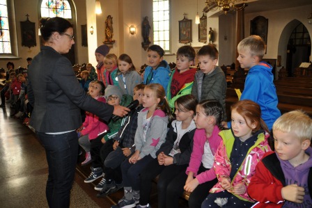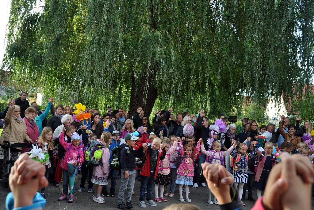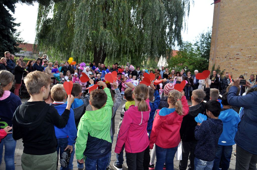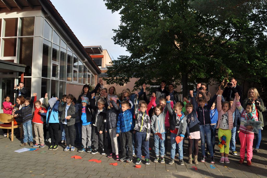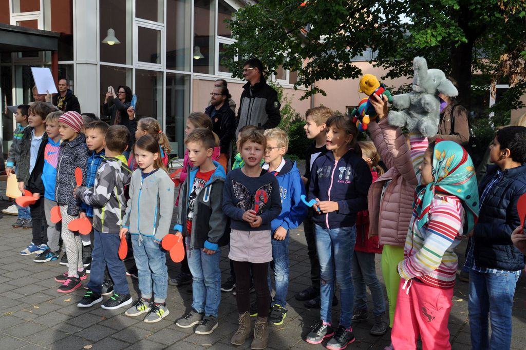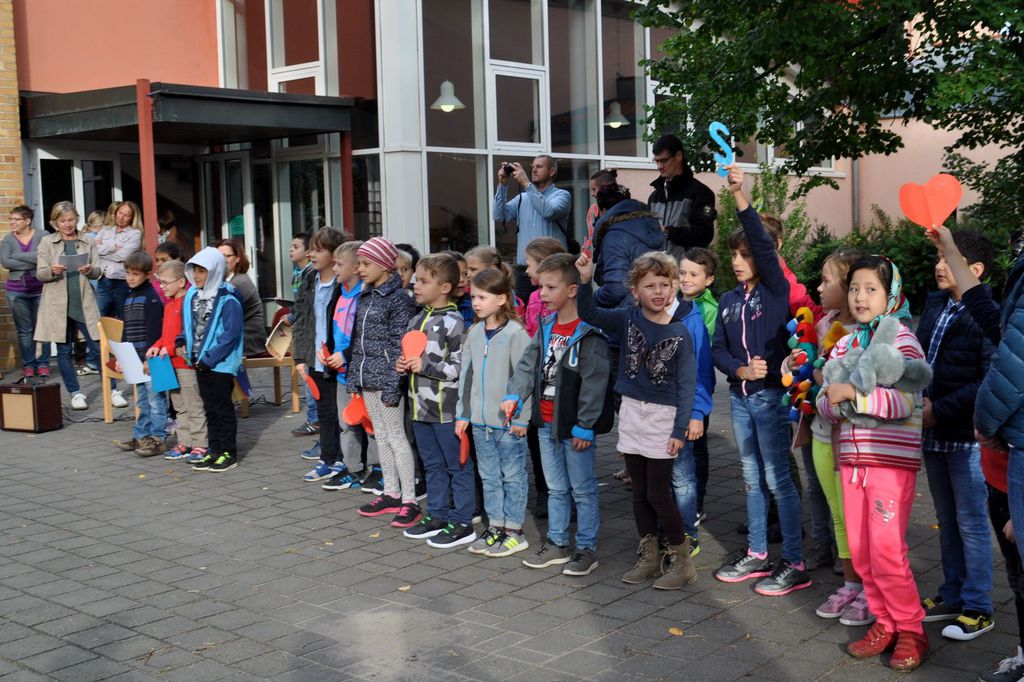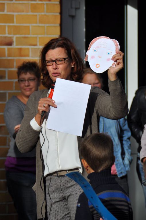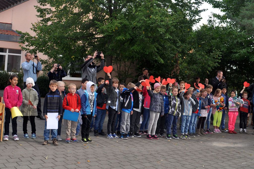 Im Anschluss daran wurden die neuen Erstklässler von den Zweitklässlern und ihren Lehrerinnen Frau Schmitt und Frau Wegner mit einem Lied willkommen geheißen. Rektorin Nicole Achter begrüßte alle Gäste und erklärte, dass neben dem Kopf und den Händen, die täglich in der Schule gebraucht werden, vor allem auch das Herz eine ganz wichtige Rolle spielt. Nur wenn wir mit dem Herzen bei der Sache sind, kann eine Arbeit gelingen und wir können uns nicht nur zu klugen und geschickten, sondern auch zu freundlichen, mitfühlenden und hilfsbereiten Menschen entwickeln. Und weil dies gemeinsam viel leichter geht, sangen alle zusammen das Lied „Hand in Hand“.