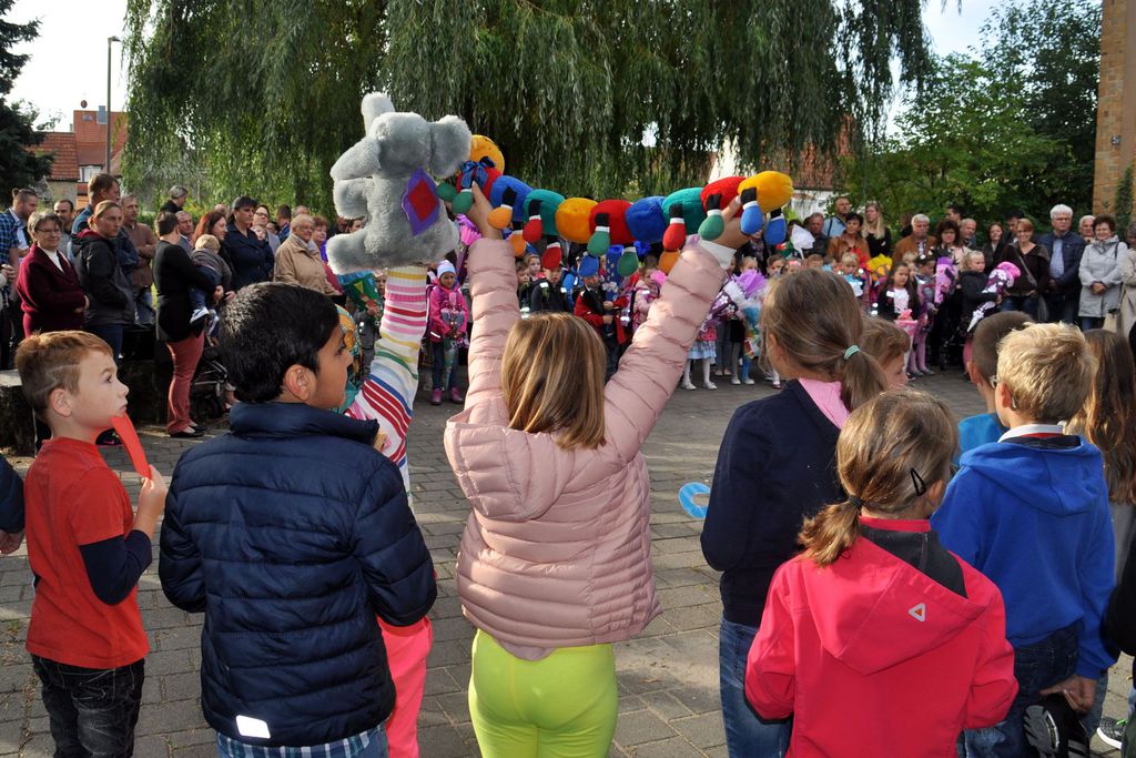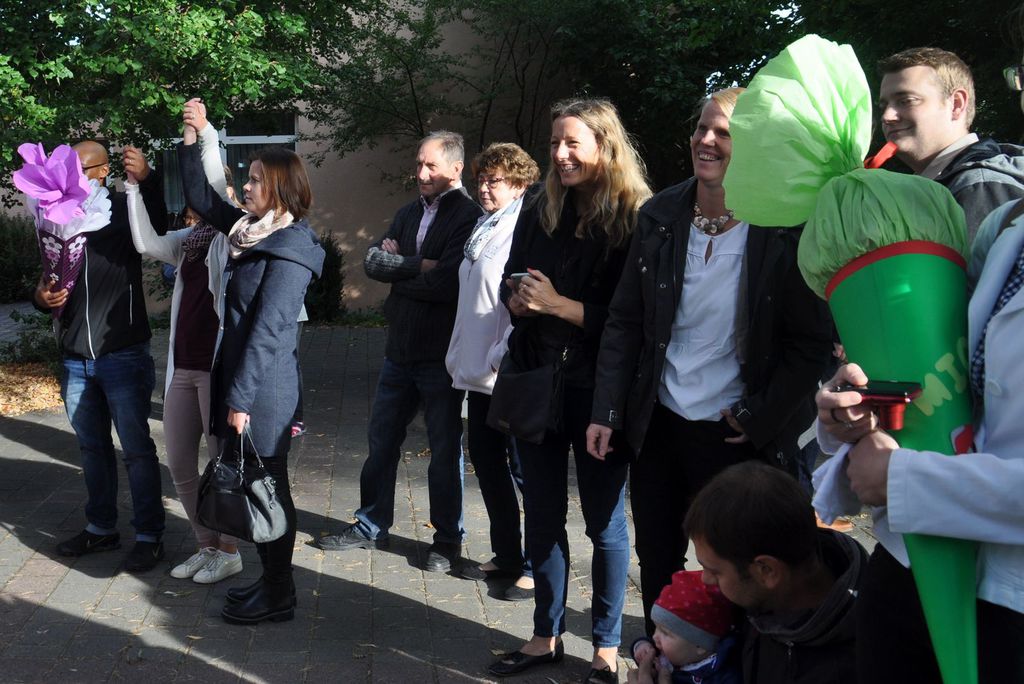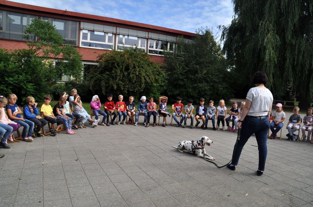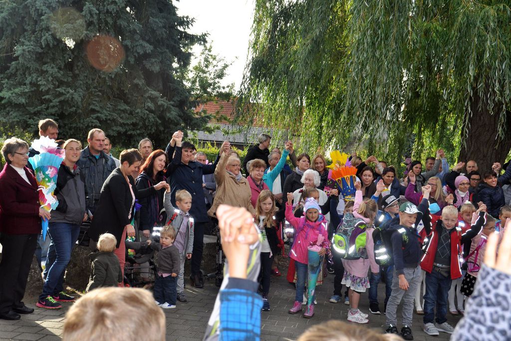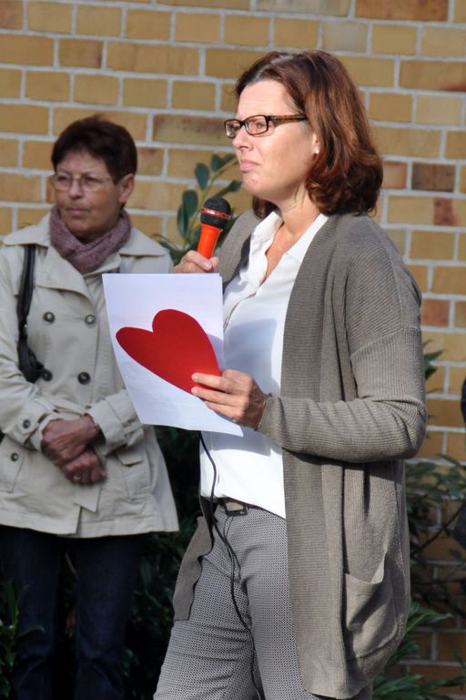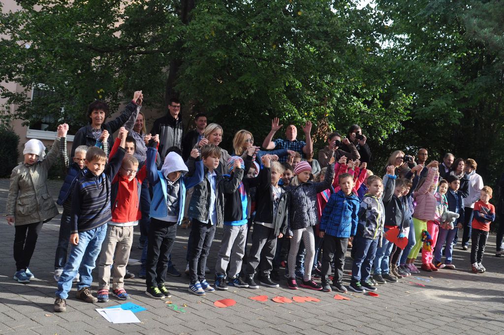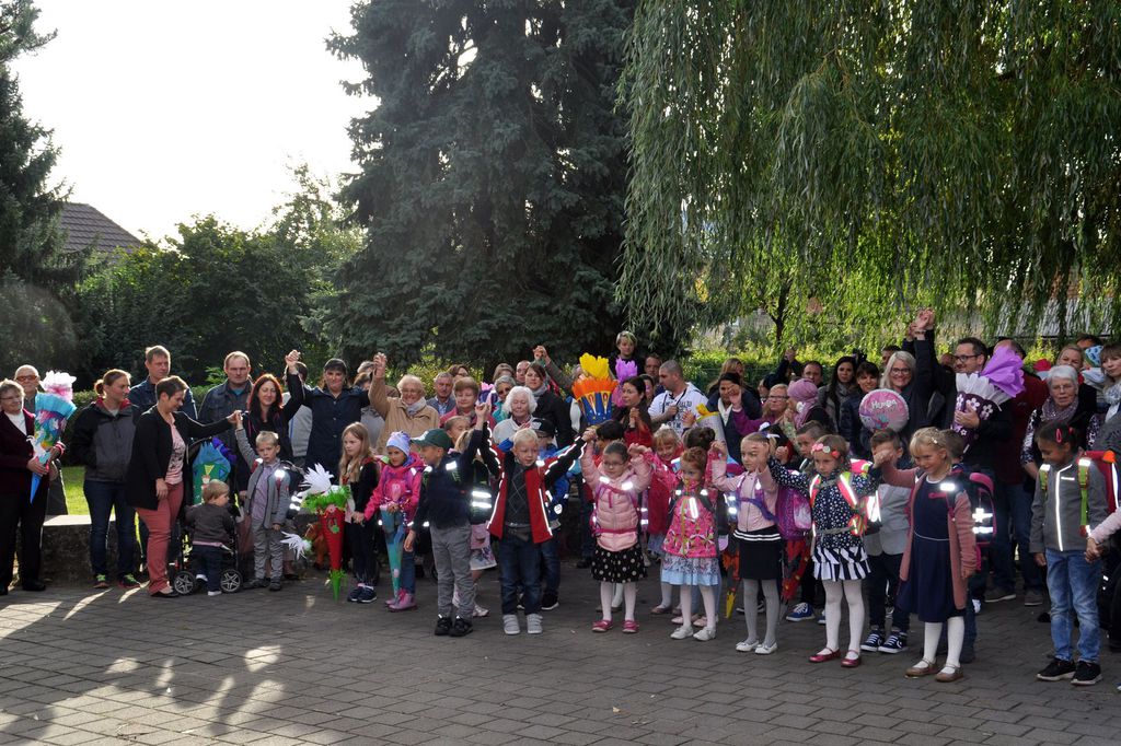 Im Anschluss daran wurden die neuen Erstklässler von den Zweitklässlern und ihren Lehrerinnen Frau Schmitt und Frau Wegner mit einem Lied willkommen geheißen. Rektorin Nicole Achter begrüßte alle Gäste und erklärte, dass neben dem Kopf und den Händen, die täglich in der Schule gebraucht werden, vor allem auch das Herz eine ganz wichtige Rolle spielt. Nur wenn wir mit dem Herzen bei der Sache sind, kann eine Arbeit gelingen und wir können uns nicht nur zu klugen und geschickten, sondern auch zu freundlichen, mitfühlenden und hilfsbereiten Menschen entwickeln. Und weil dies gemeinsam viel leichter geht, sangen alle zusammen das Lied „Hand in Hand“.