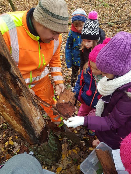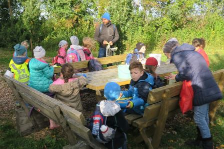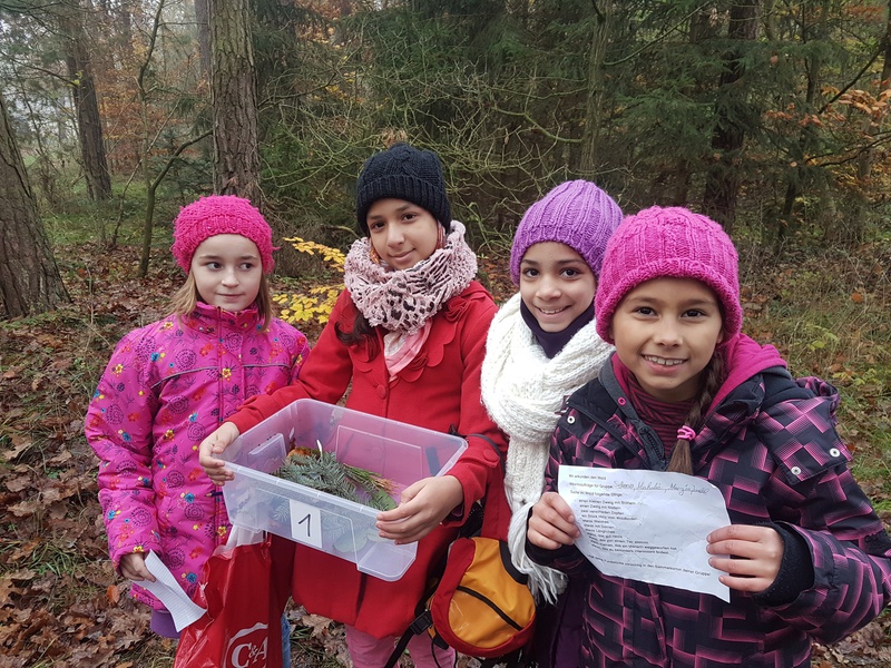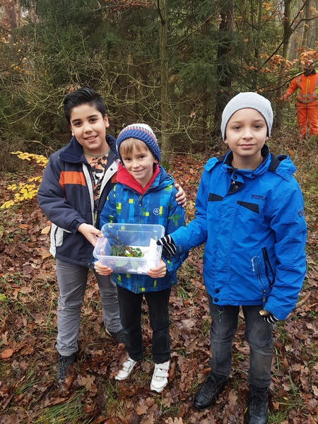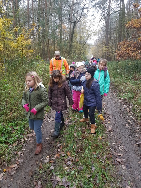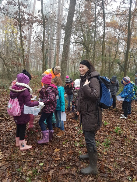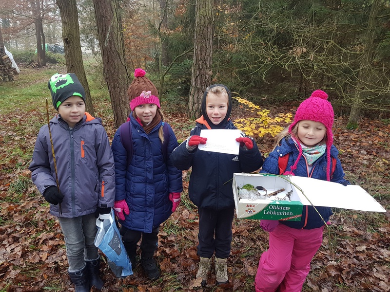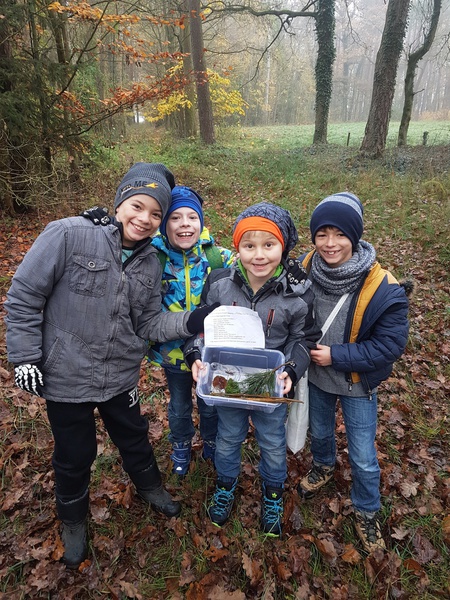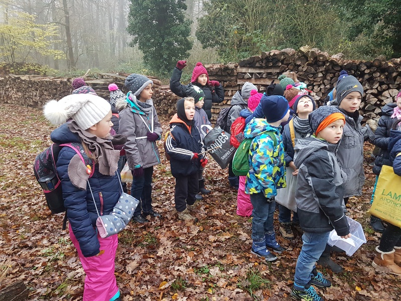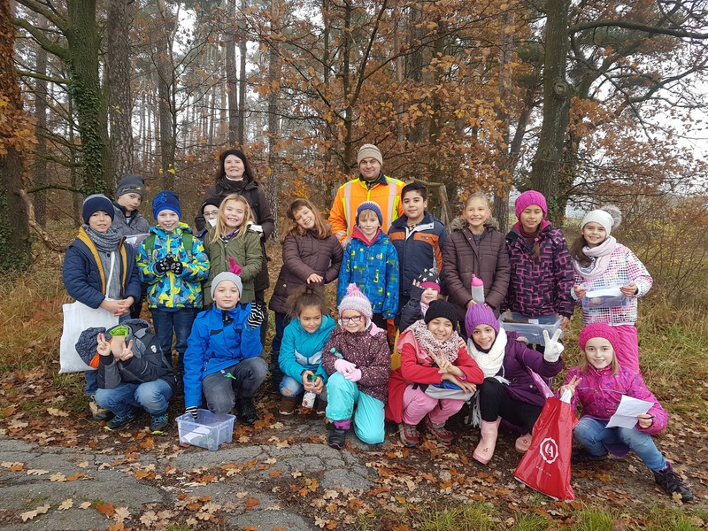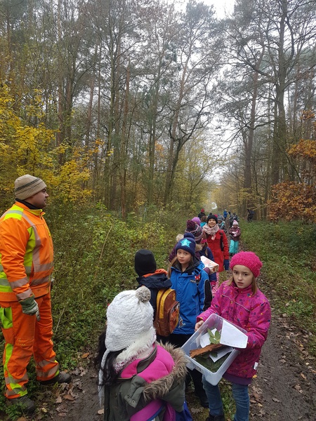 Am Mittwoch, den 15. November besuchten die beiden dritten Klassen mit Frau Achter und Frau Spitzer unter der Führung des Waldbeauftragten Herrn Hartmann den Klein-langheimer Wald. An Holzlegen wurde erklärt, welches Holz in diesem Wald zu finden ist und wann es geschlagen wird. Herr Hartmann zeigte verschiedene Holzarten und ließ die Kinder die umliegenden Bäume bestimmen. Endlich konnten die Schüler das im Unterricht Gelernte "live" erleben und Vieles "begreifen". Die Kinder waren eifrig dabei und entdeckten noch viele weitere Naturbesonderheiten im Wald: Pilze, Sträucher, Moose, Laub- und Nadelbäume und verschiedene Tiere. Sogar Bauten von Fuchs, Dachs und ein flüchtendes Reh konnten wir bestaunen. Herr Hartmann beantwortete geduldig alle Fragen der Kinder. In Gruppenarbeit wurden fleißig Fundstücke gesammelt, die später auch im Klassenzimmer an den schönen Tag erinnerten.