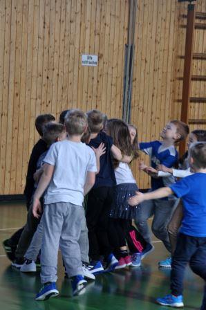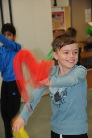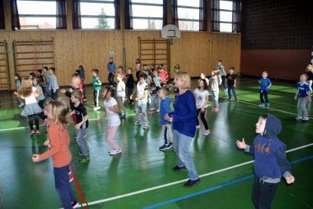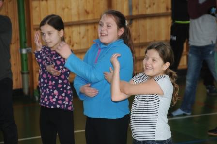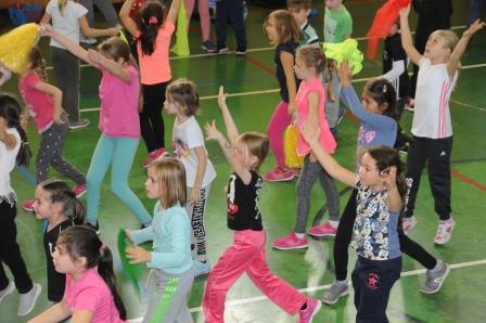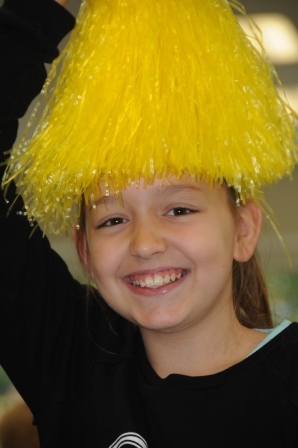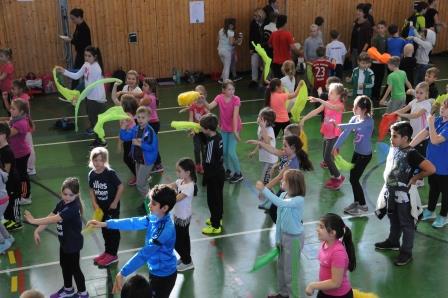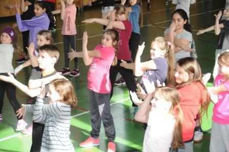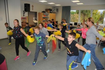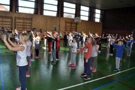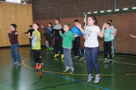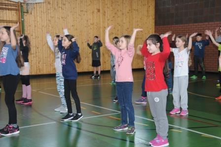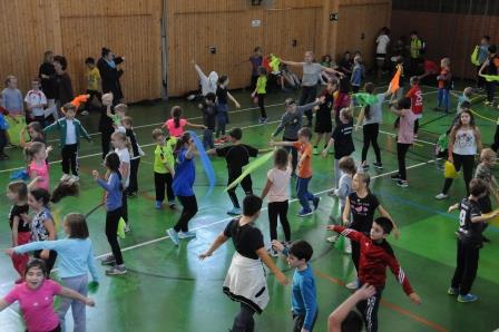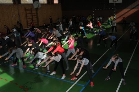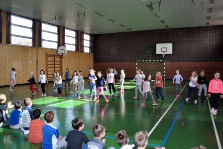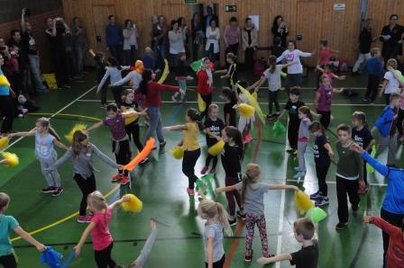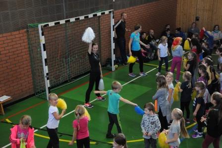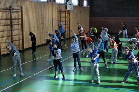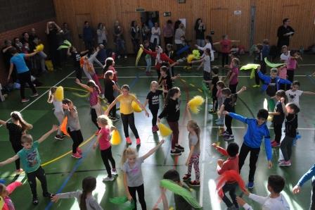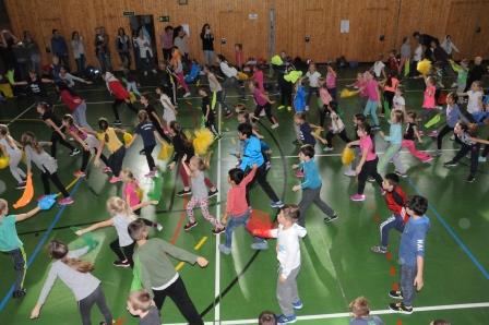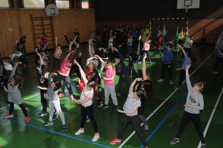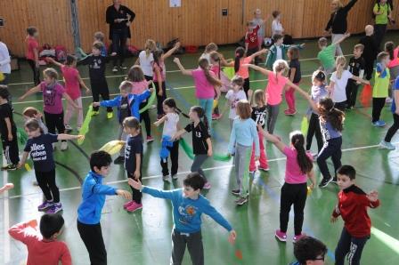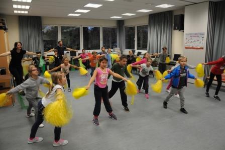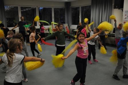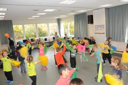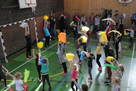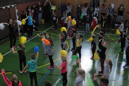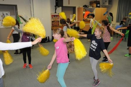 Anfeuert werden durfte im „Fanclub“. Hier studierten die Schüler mit viel Eifer und Freude einen Tanz mit Tüchern und Pompons zum „Ballhelden-Song ein.