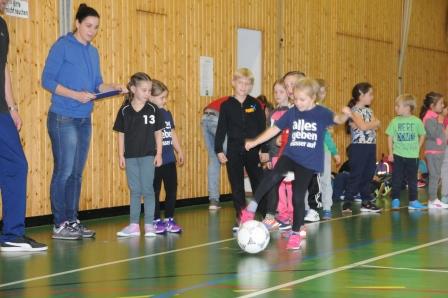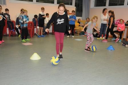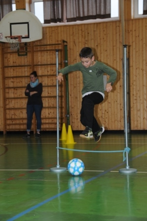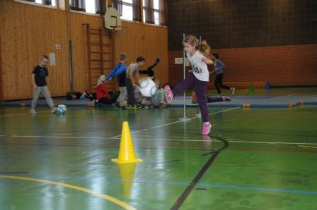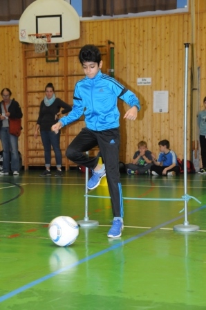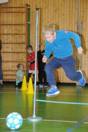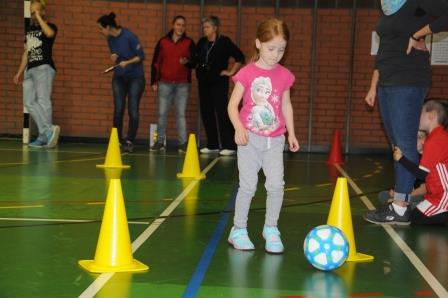 An der Station „Dribbelkünstler“ konnten die Kinder zeigen wie gut sie den Ball mit dem Fuß dribbeln können: zwischen und um Hütchen und unter einem gespannten Seil welches anschließend übersprungen werden musste.