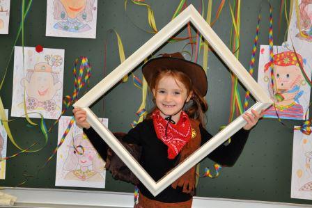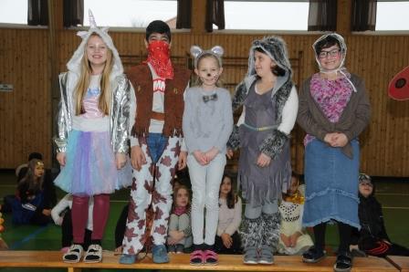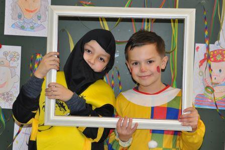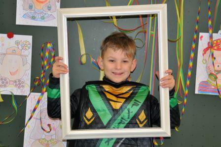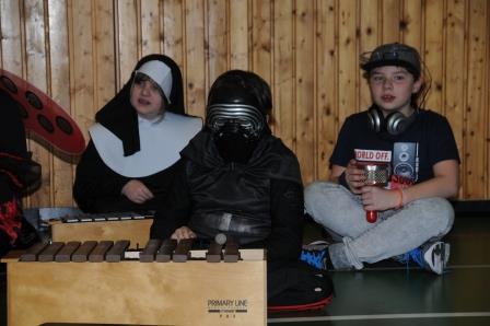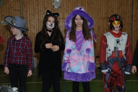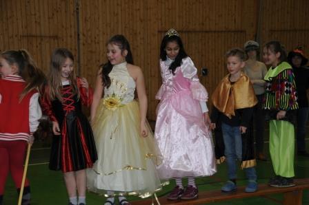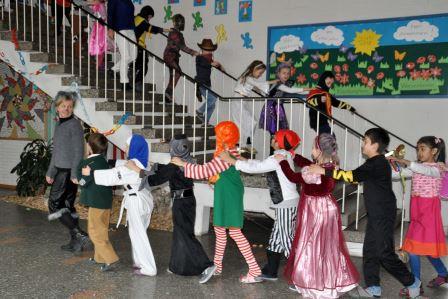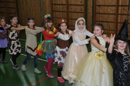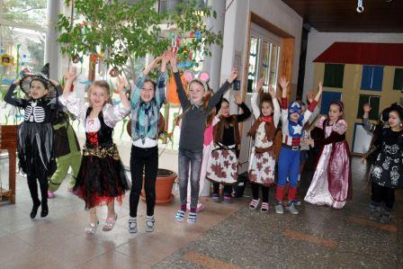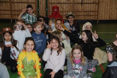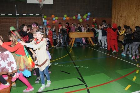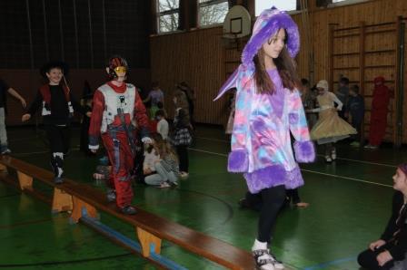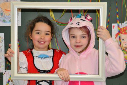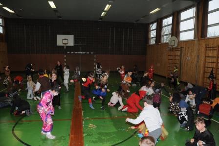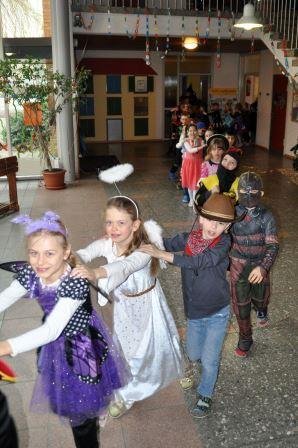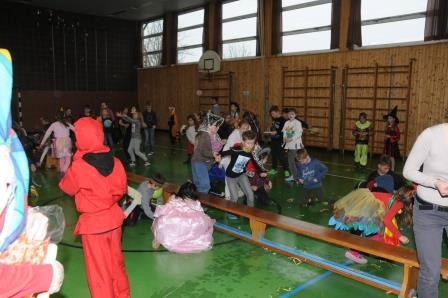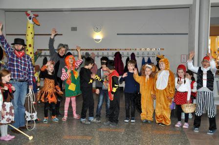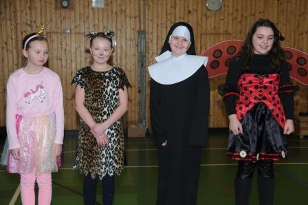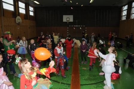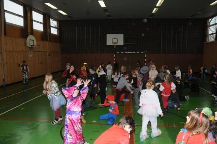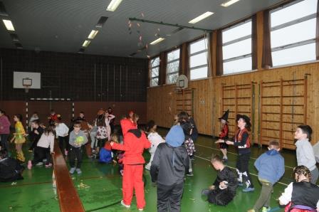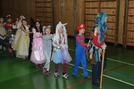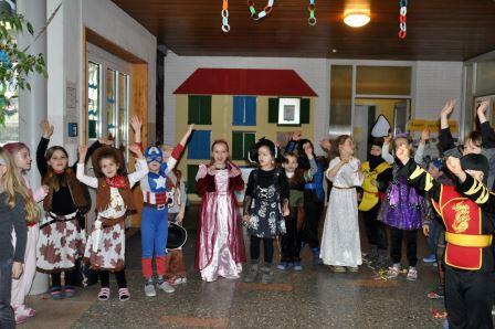Nach der Pause startete das närrische Treiben mit Partyspielen wie Zeitungstanz, Zublinzeln, Reise nach Jerusalem u.v.a.m. in den Klassenzimmern. Die bunt verkleideten Erst- und Zweitklässler durften sich auch vor der Kamera präsentieren. Anschließend zog das Narrenvolk in einer Polonaise mit viel Helau durch das Großlangheimer Schulhaus. Beim „Fliegerlied“ und dem „Roten Pferd“ wurde ausgelassen getanzt, bis alle mächtig ins Schwitzen kamen. Dann endlich regnete es Süßigkeiten, die von den Kindern eifrig aufgesammelt wurden. Bestens gelaunt starteten die kleinen Narren schließlich in die Winterferien. Ein herzliches Dankeschön an alle Eltern, die für unsere Feier Luftschlangen, Süßigkeiten, Krapfen und Mohrenköpfen spendeten.