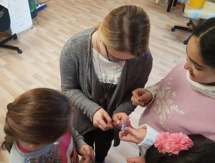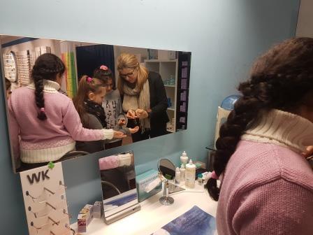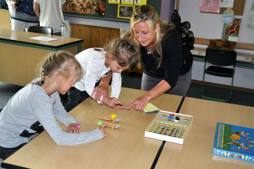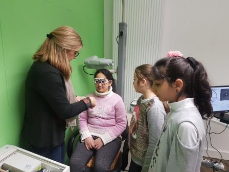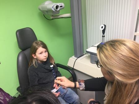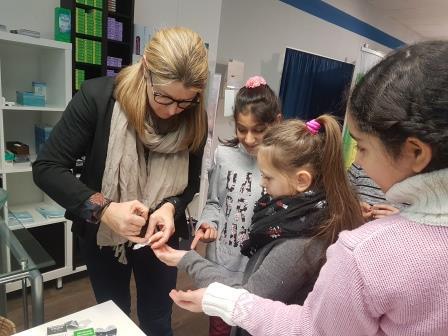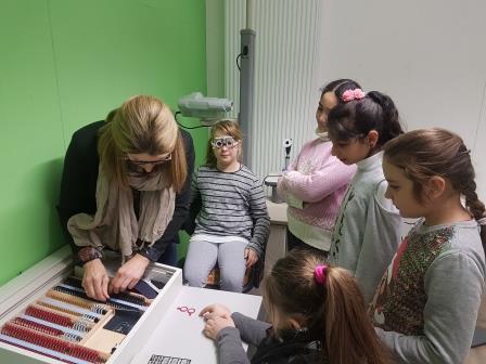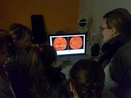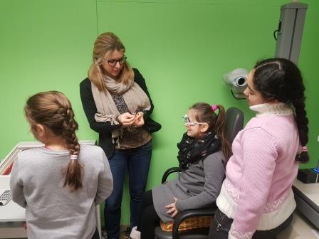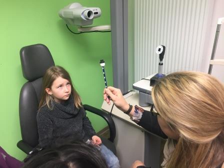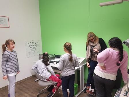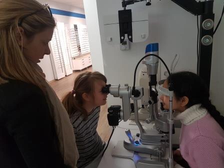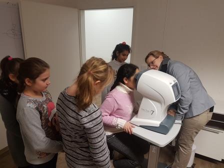 Augenoptikermeisterin Petra Bergmann überprüfte die Pupillenreaktion, Sehschärfe und ermöglichte einen stark vergrößerten Blick ins Auge. Sie zeigte den Kindern Kontaktlinsen, die neben der Brille eine Möglichkeit zum Ausgleich einer Sehschwäche sind.