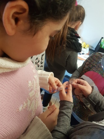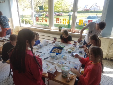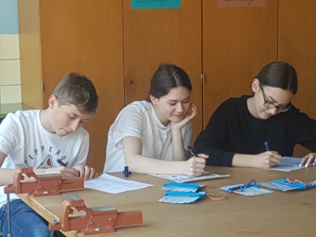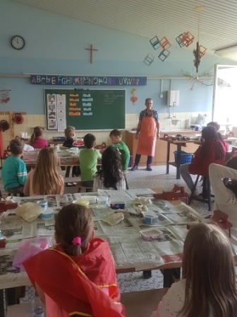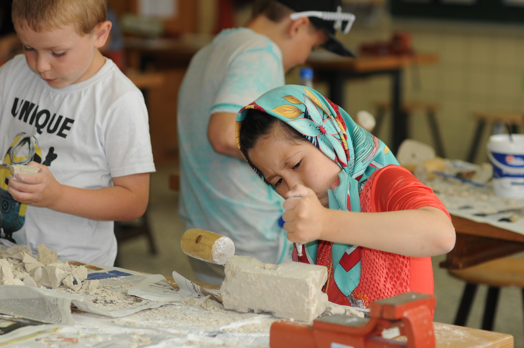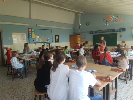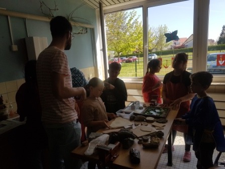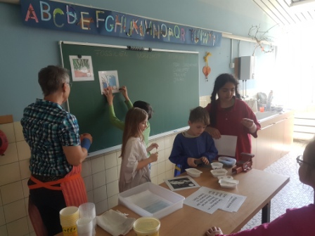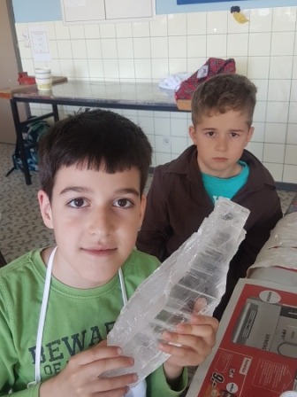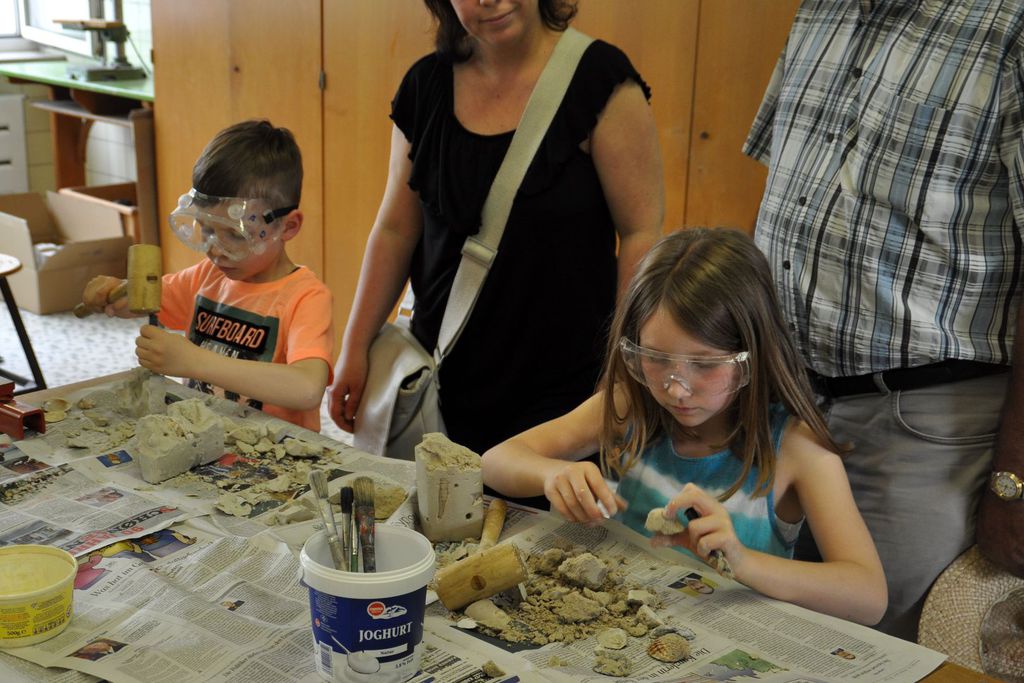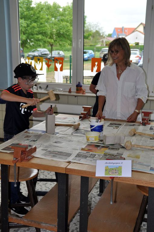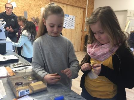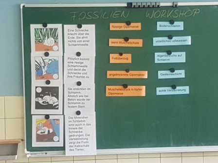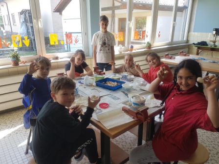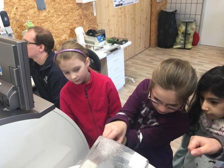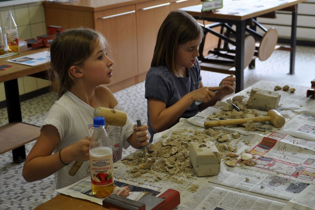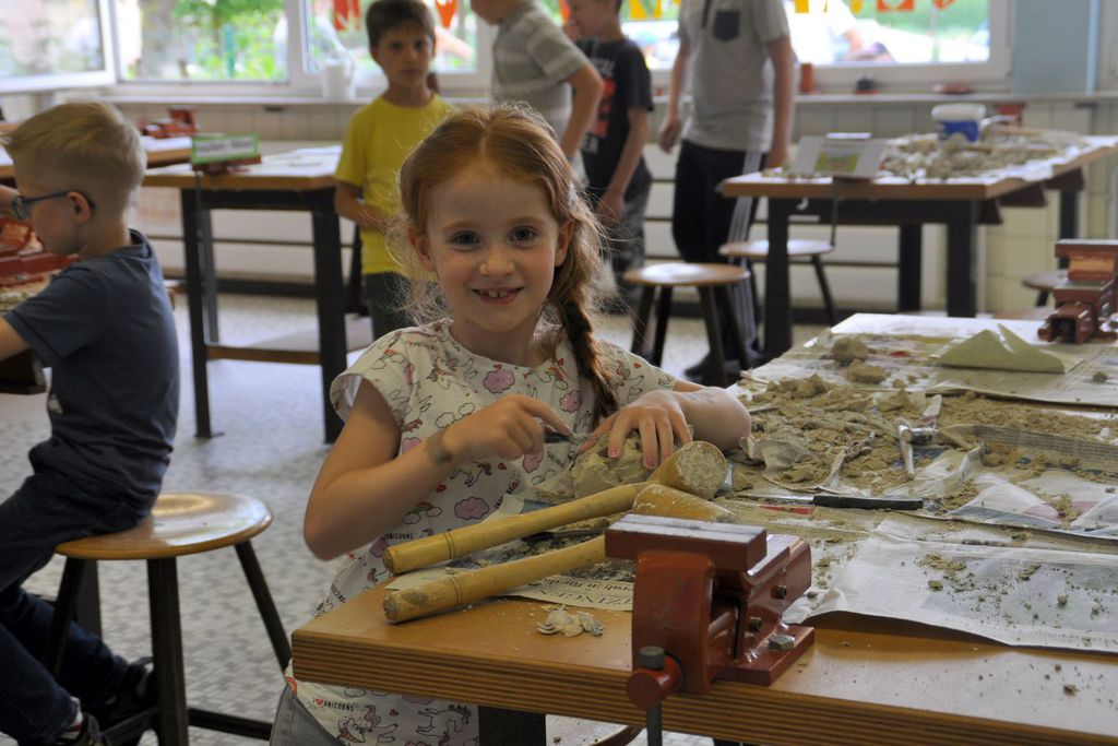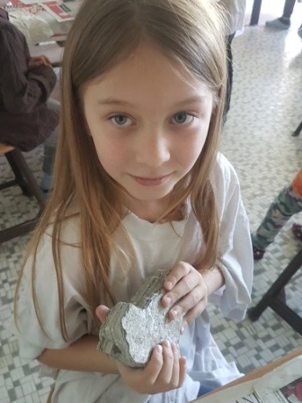 In mitgebrachte Becher wurde nach gründlichem Einfetten mit Vaseline angerührter Gips gegossen, in den verschiede – auch gut eingefettete Muscheln oder Schneckenhäuser gepresst wurden. Während der Wartezeit beim Trocknen erfuhren die Kinder viel über die Entstehung von Fossilien und den Baustoff Gips. Er wird z. B. im Bergwerk in Hüttenheim als Anhydrit abgebaut. Außerdem wird Gips auch oberirdisch in Gipssteinbrüchen abgebaut. Frau Sandmeyer hatte auch Exemplare von Fasergips und Gipskristall, der auch „Marienglas“ genannt wird, dabei.