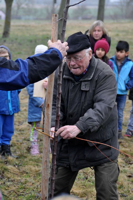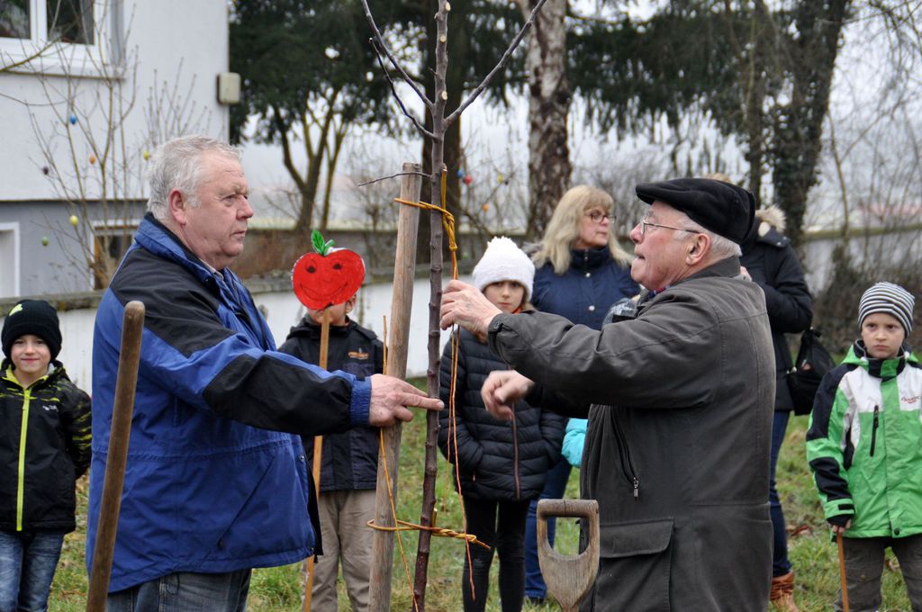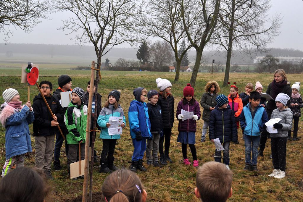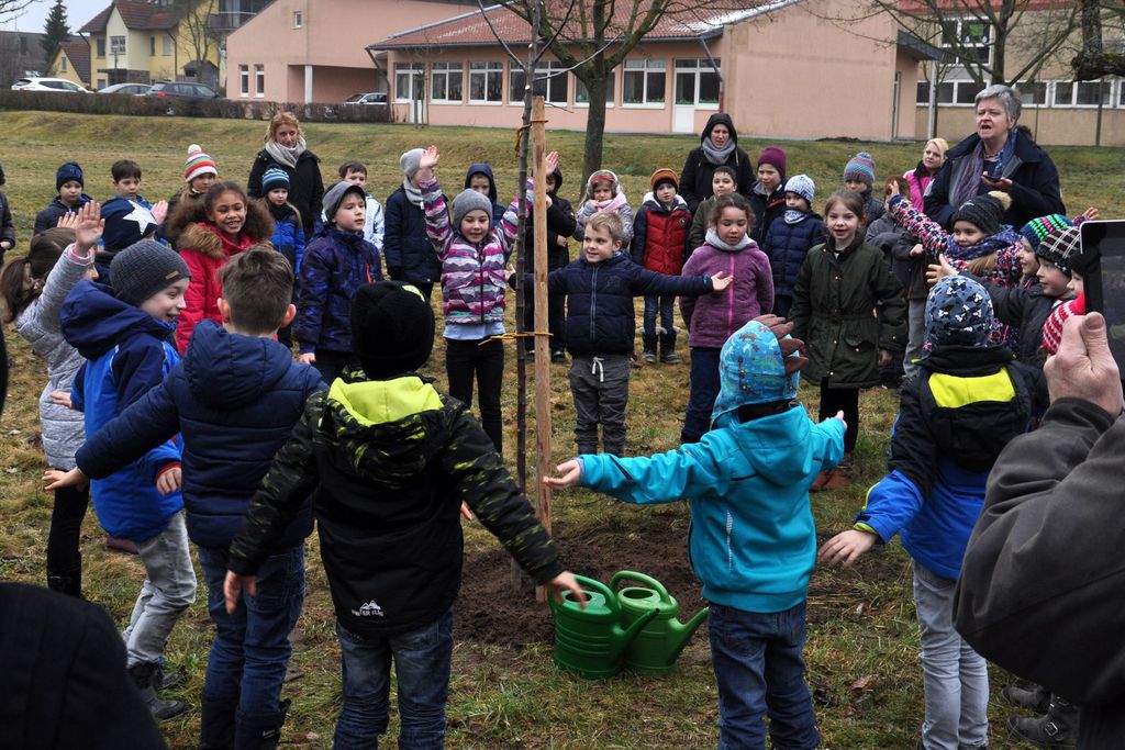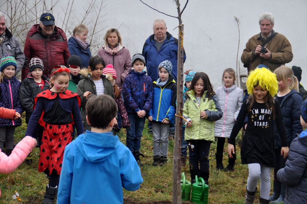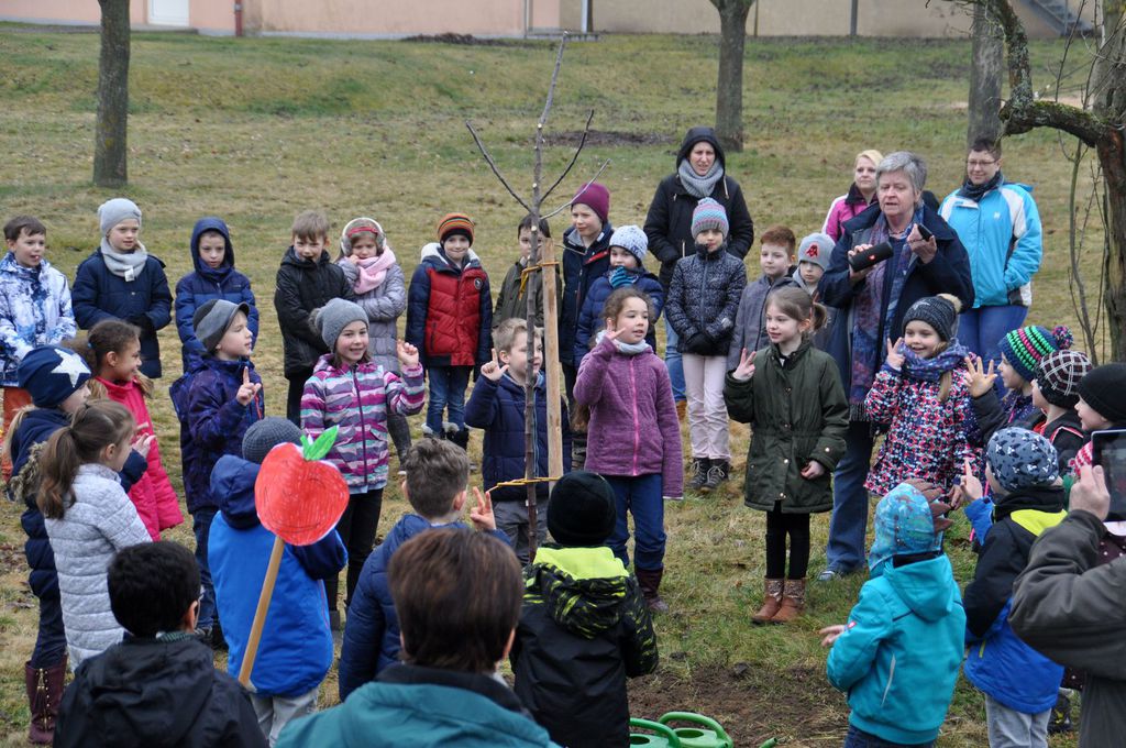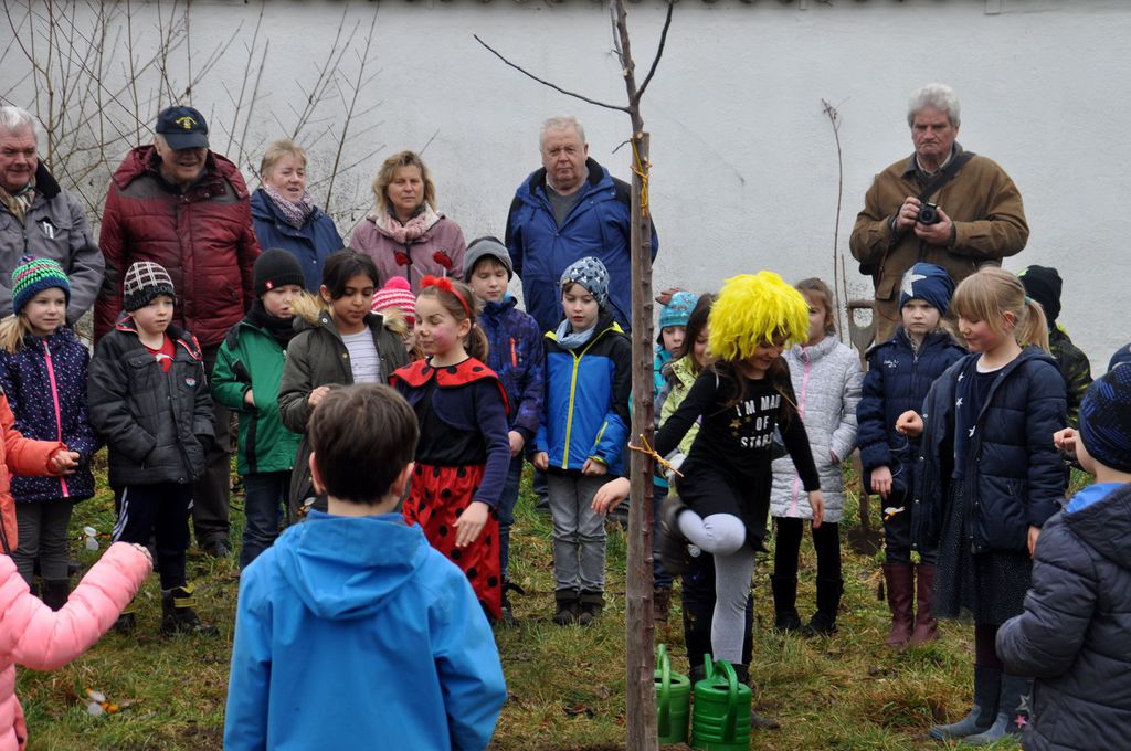Am Tag des Baumes pflanzte der Obst- und Gartenbauverein Großlangheim mit Unterstützung der Erst- und Zweitklässler in diesem Jahr einen Apfelhochstamm der Sorte „Maggy“. Begleitet von Liedern, Gedichten und guten Wünschen wurde der Baum am letzten Schultag vor den Osterferien hinter dem Schulhaus in die Erde gebracht. Der Vorsitzende des Obst- und Gartenbauvereins, Herr Dietmar Brendt, erklärt den Kindern, dass die Apfelsorte „Maggy“ mit ihren roten Blüten und rotem Fruchtfleisch aus Frankreich stamme, aber in Edingen gezüchtet wurde. Nach Grußworten von Bürgermeister Karl Höchner, sorgten Herr Brendt und seine Helfer für das leibliche Wohl aller Anwesenden. Die Kinder, Eltern und Lehrer ließen sich in der Aula Brötchen mit Wurst und den aus der Apfelsorte „Maggy“ gepressten Apfelsaft schmecken, bevor sie gut gelaunt in die Osterferien starteten. Ein herzliches Dankeschön an den Obst- und Gartenbauverein Großlangheim!