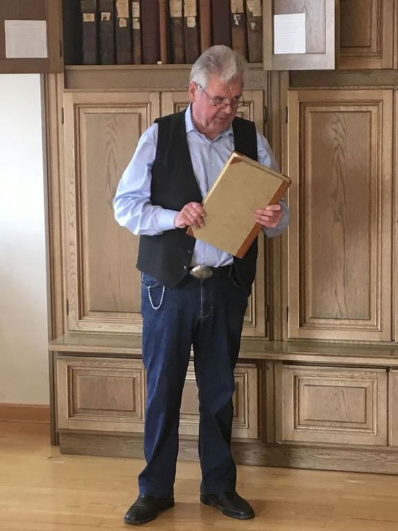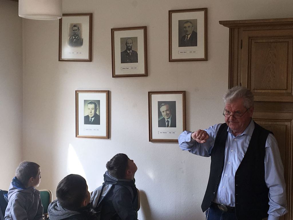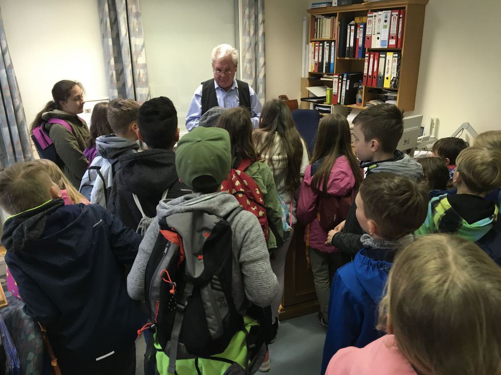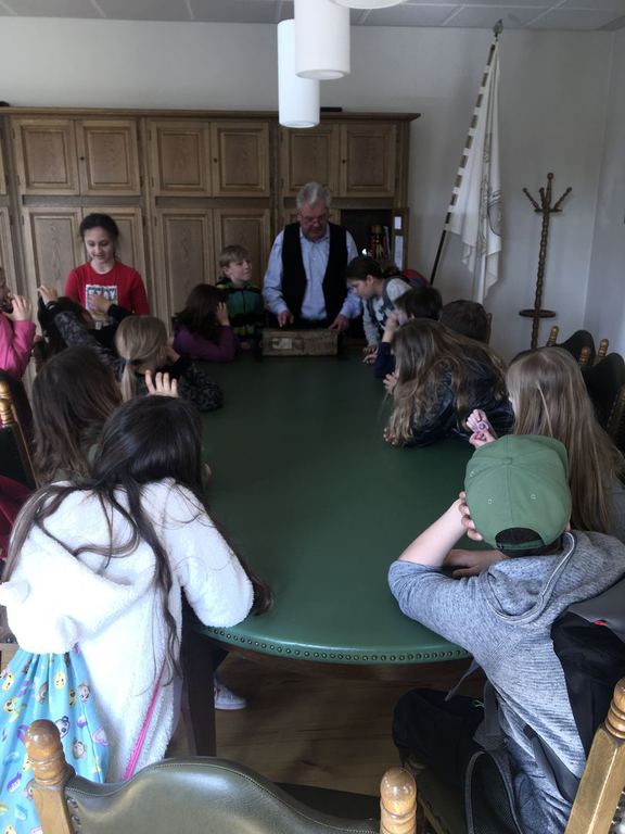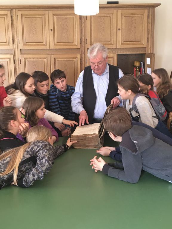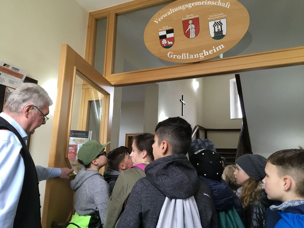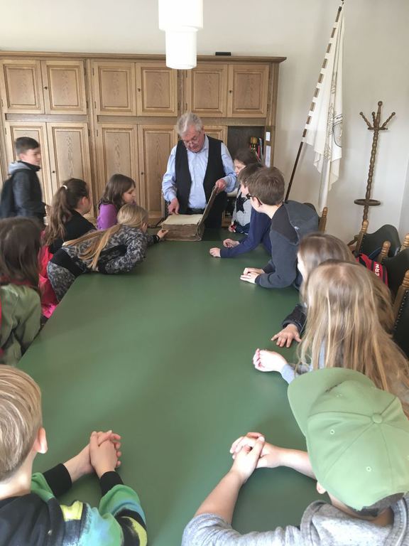 Am Mittwoch, den 11. April 2018, gingen wir um 7.45 Uhr an der Kleinlangheimer Schule los. Wir wollten Bürgermeister Höchner in Großlangheim treffen. Der Weg von Kleinlangheim dauerte ungefähr eine Stunde. Als wir dort ankamen, begrüßte uns Herr Höchner sehr freundlich. Er zeigte uns das VG- Gebäude mit den Ämtern und den Angestellten, die ihre Arbeiten erklärten. Danach führte er uns ins Rathaus. Dort gingen wir in den Sitzungssaal. Wir durften am Ratstisch Platz nehmen. Herr Höchner zeigte uns sehr alte Bücher aus dem 16., 17. und 18. Jahrhundert. Zum Schluss bekamen wir Süßigkeiten von Herrn Höchner. Wir hatten auch eine Kleinigkeit für ihn als Dank dabei. Den Ausflug fanden wir sehr interessant. Um 11 Uhr fuhren wir mit dem Bus wieder nach Kleinlangheim zurück.