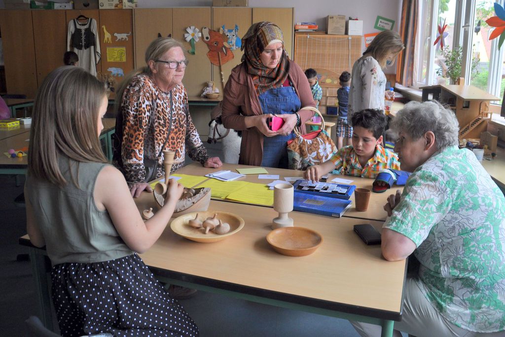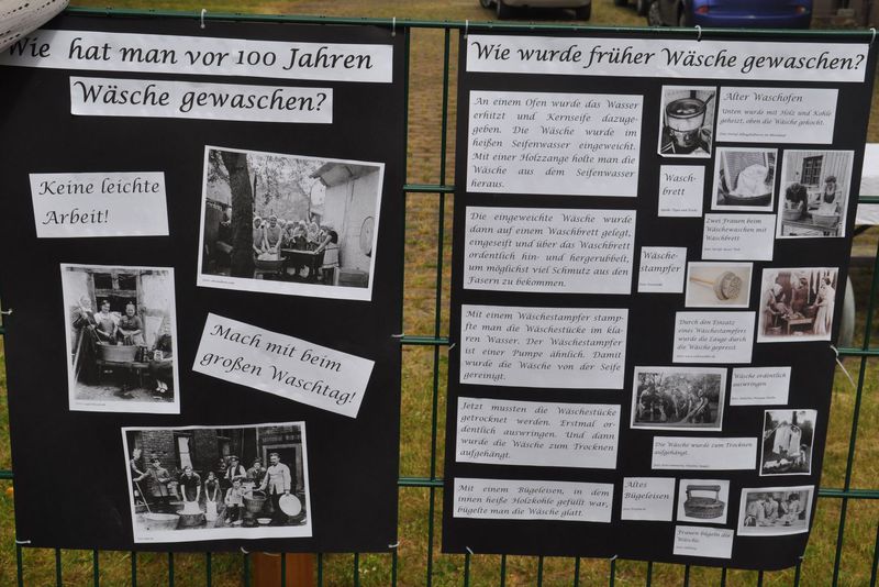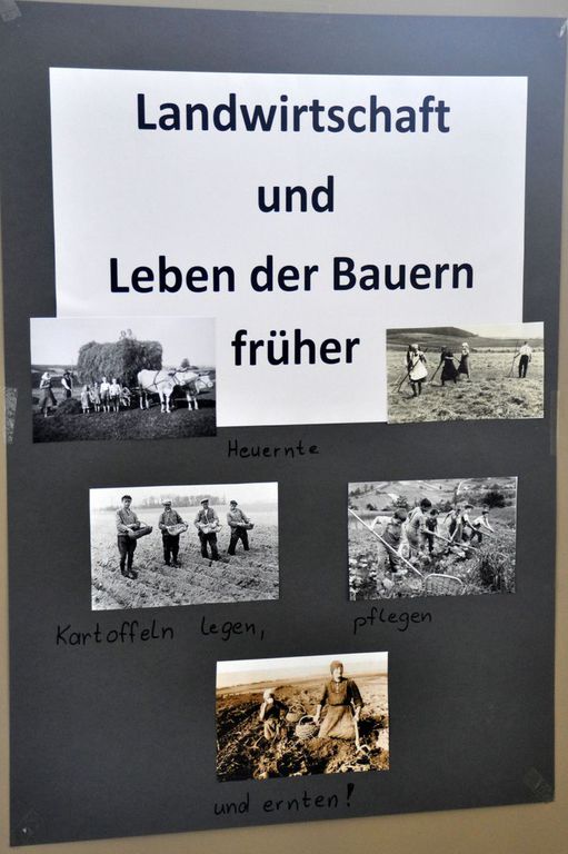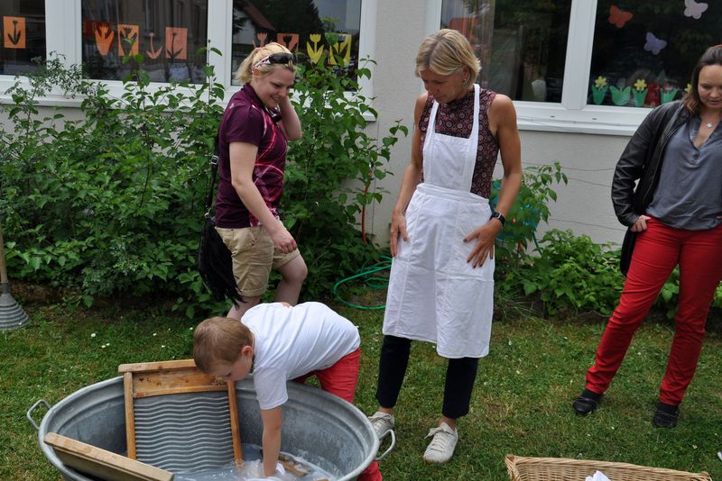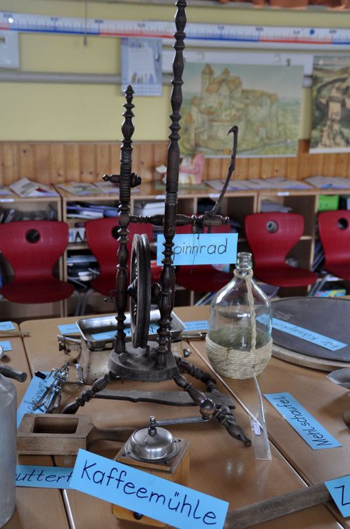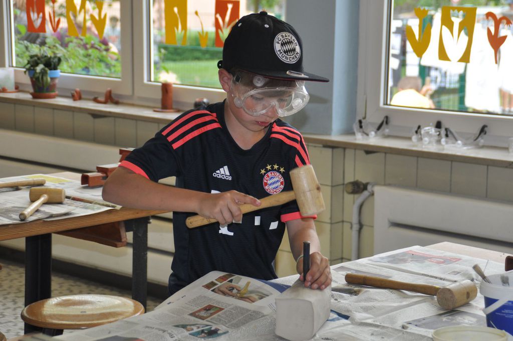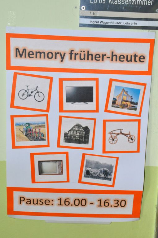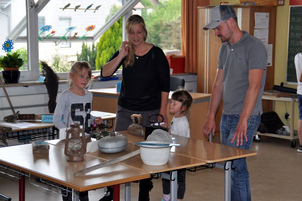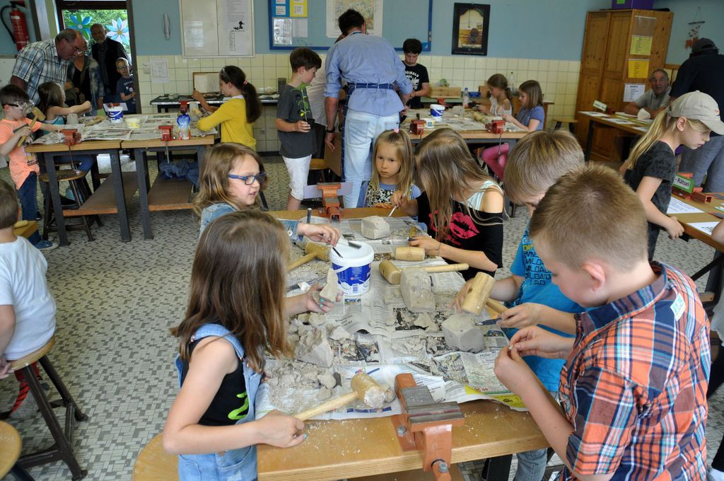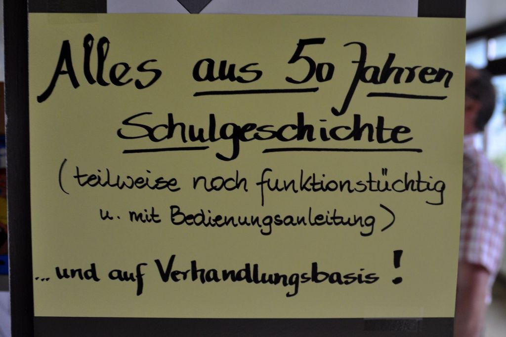 Dass es neben dem Schuljubiläum beim Schulfest auch um altes Handwerk ging, zeigten die Viertklässler eindrucksvoll mit ihrem Klatschlied „Hammerschmiedsgselln“ und verwiesen damit auf die vielen Stationen, die im Anschluss an das Eröffnungsprogramm zum Entdecken und Ausprobieren einluden. Landwirtschaftliche Geräte konnten bestaunt werden, Wäsche mit dem Waschbrett gewaschen, Bilder von früher und heute zugeordnet, alte Spiele für drinnen und draußen und alte Schrift ausprobiert werden. Kinderfotos und Pflanzen mussten erraten, Fossilien konnten geklopft und altes Schulhausinventar gekauft werden, die Mittagsbetreuung lud zum freien Malen und Spielen ein und die Schulhausgänge zierten Fotowände der vergangenen 50 Jahre und geschichtliche Rückblicke.