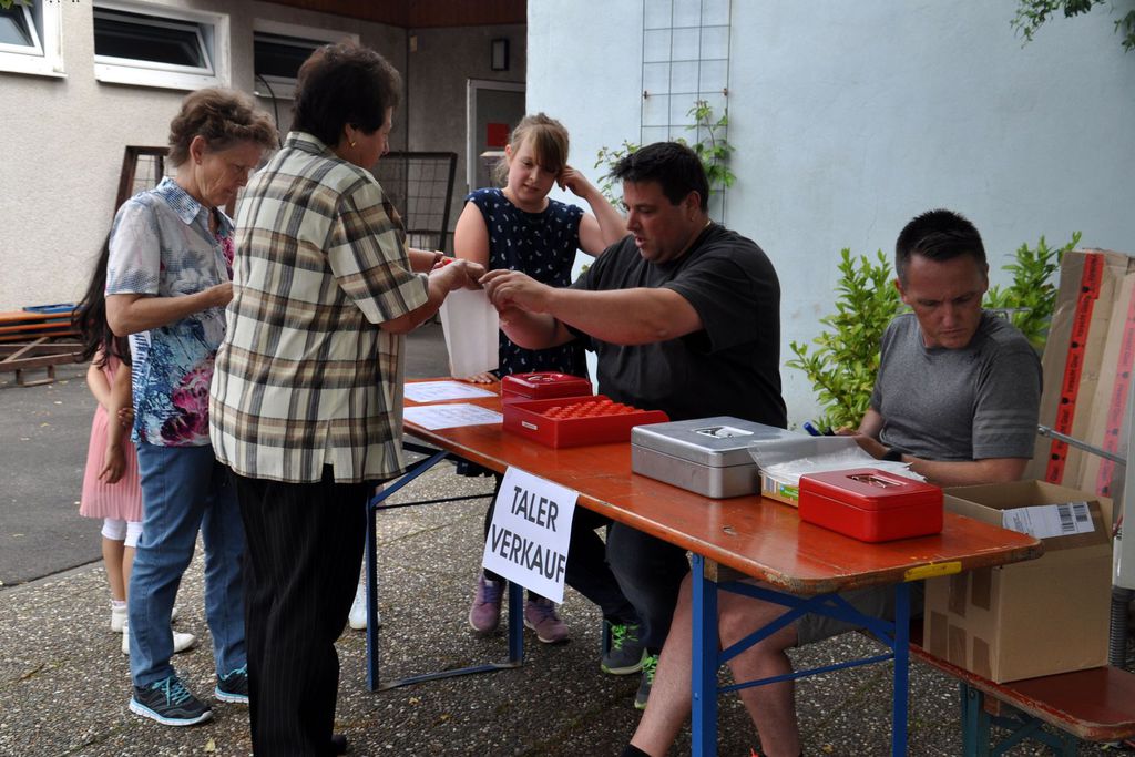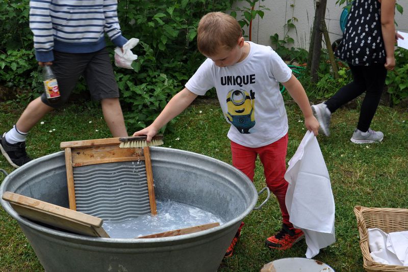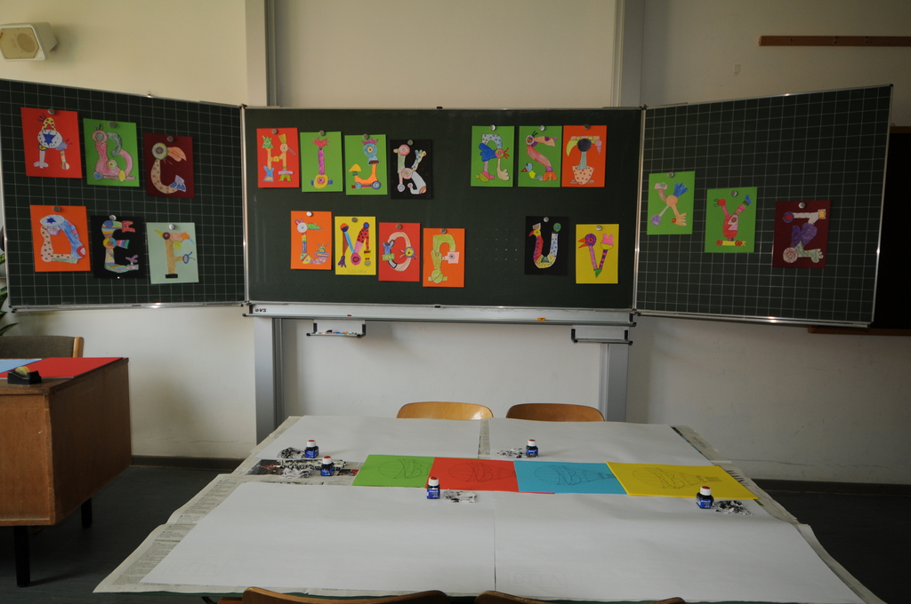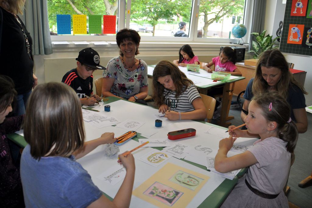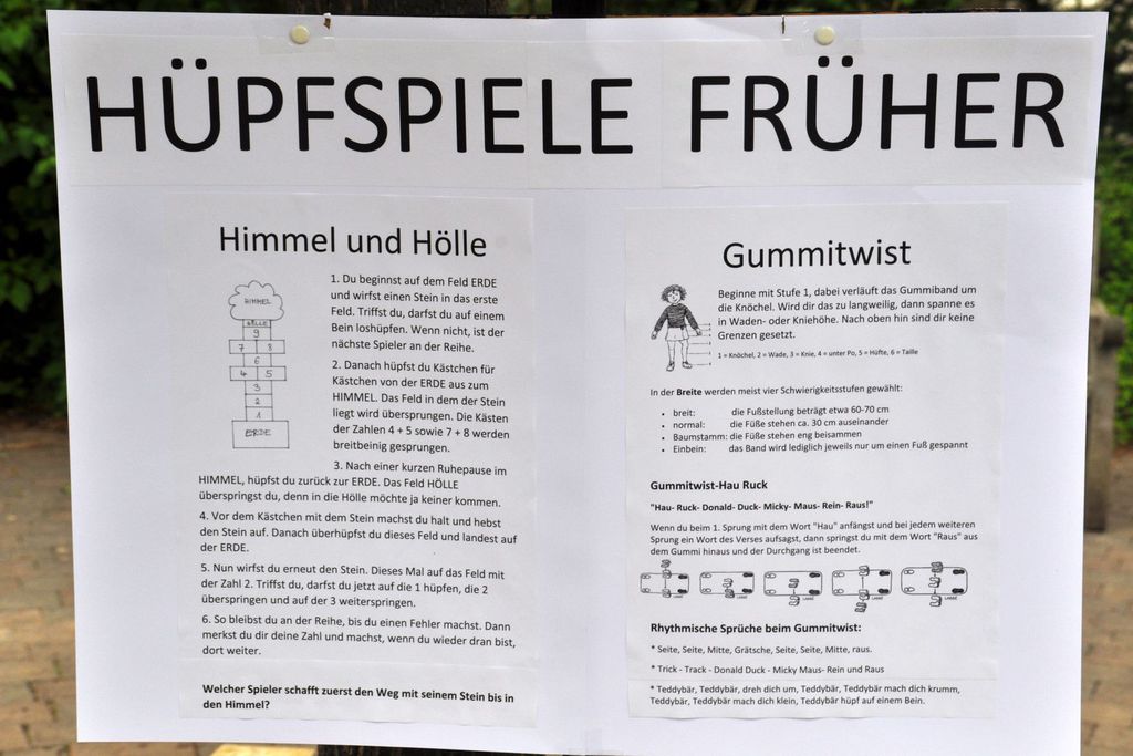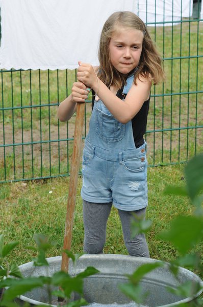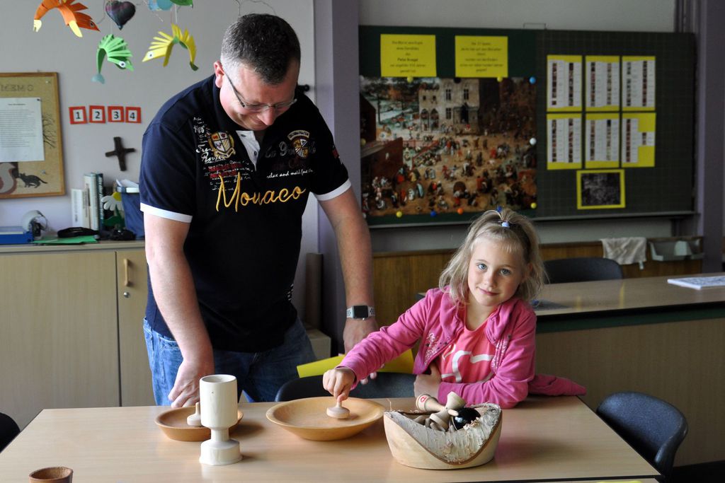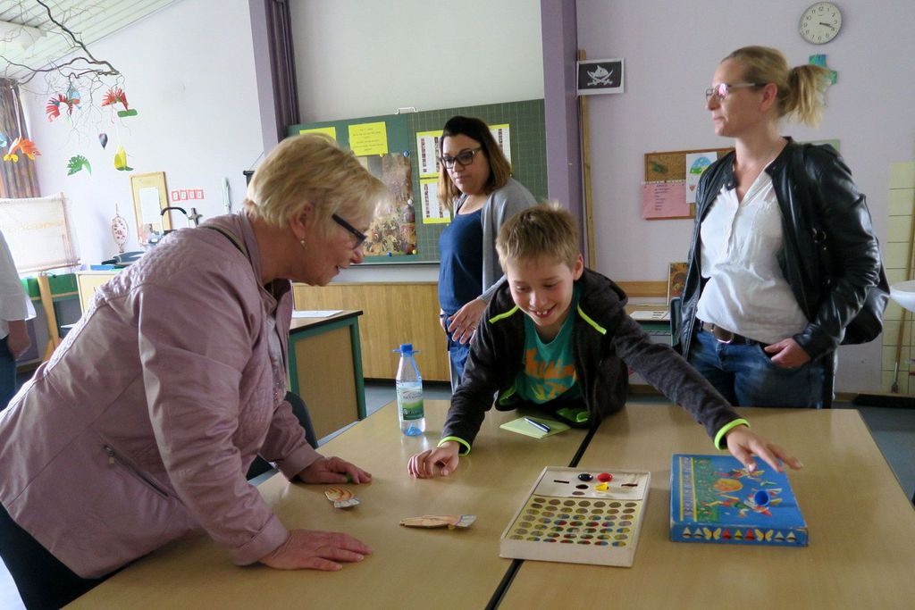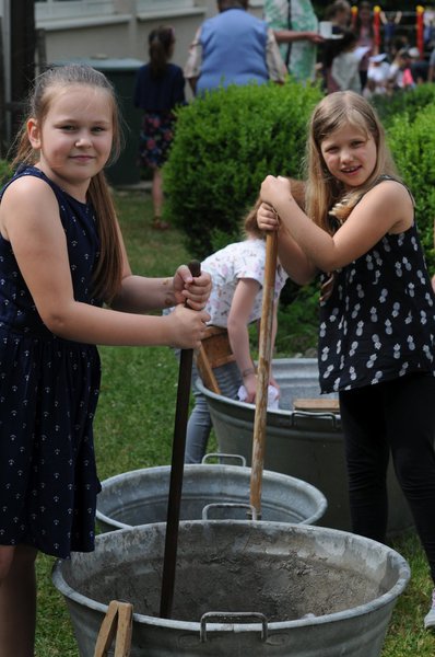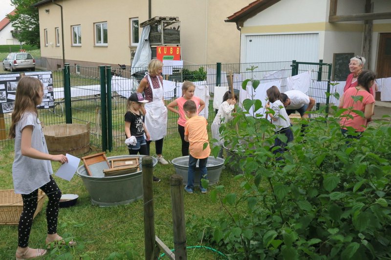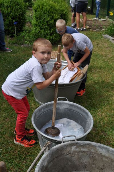 Dass es neben dem Schuljubiläum beim Schulfest auch um altes Handwerk ging, zeigten die Viertklässler eindrucksvoll mit ihrem Klatschlied „Hammerschmiedsgselln“ und verwiesen damit auf die vielen Stationen, die im Anschluss an das Eröffnungsprogramm zum Entdecken und Ausprobieren einluden. Landwirtschaftliche Geräte konnten bestaunt werden, Wäsche mit dem Waschbrett gewaschen, Bilder von früher und heute zugeordnet, alte Spiele für drinnen und draußen und alte Schrift ausprobiert werden. Kinderfotos und Pflanzen mussten erraten, Fossilien konnten geklopft und altes Schulhausinventar gekauft werden, die Mittagsbetreuung lud zum freien Malen und Spielen ein und die Schulhausgänge zierten Fotowände der vergangenen 50 Jahre und geschichtliche Rückblicke.