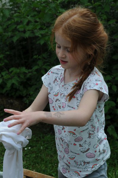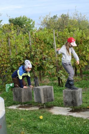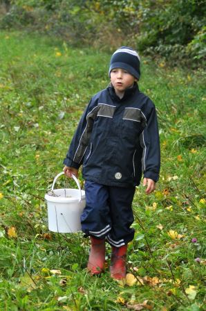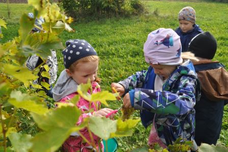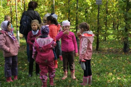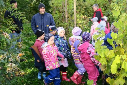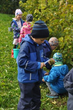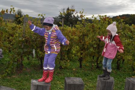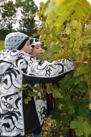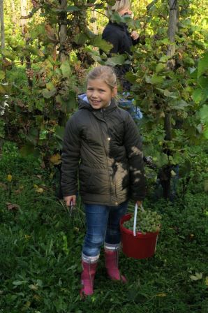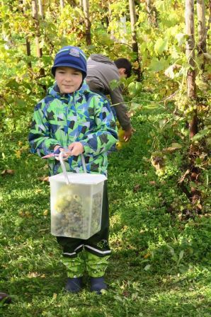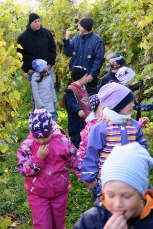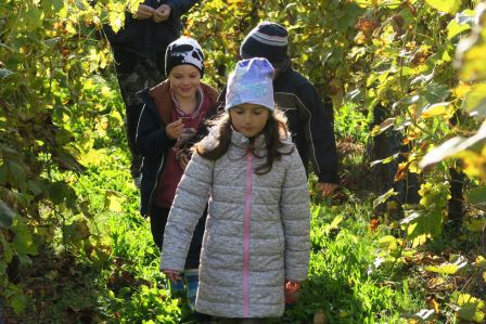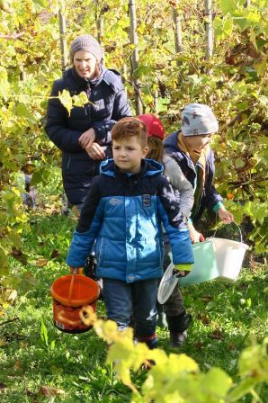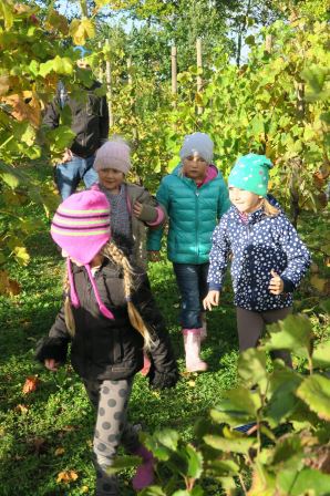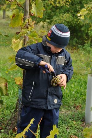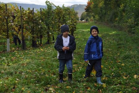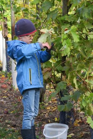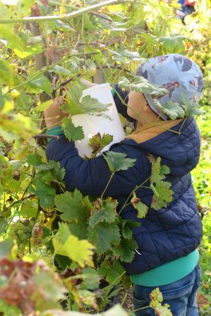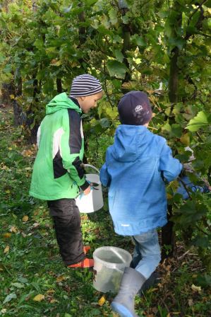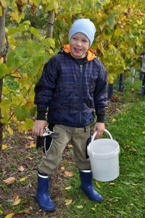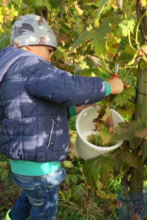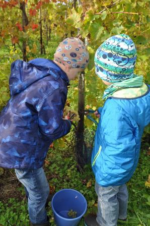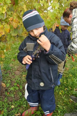 Während die Erstklässler zunächst begeistert die verschlungenen Wege des Weinlabyrinths erforschten, begannen die Großen schon einmal mit der Lese der Trauben. Herr Gebert erklärte ihnen vorher, worauf es dabei ankam: Nur gute Beeren sollten in das Eimerchen, die faulen sollten vorher herausgeschnitten werden. Nach der Halbzeit durften dann die Gruppen wechseln und die Schulanfänger machten sich mit großem Eifer an die Arbeit.
