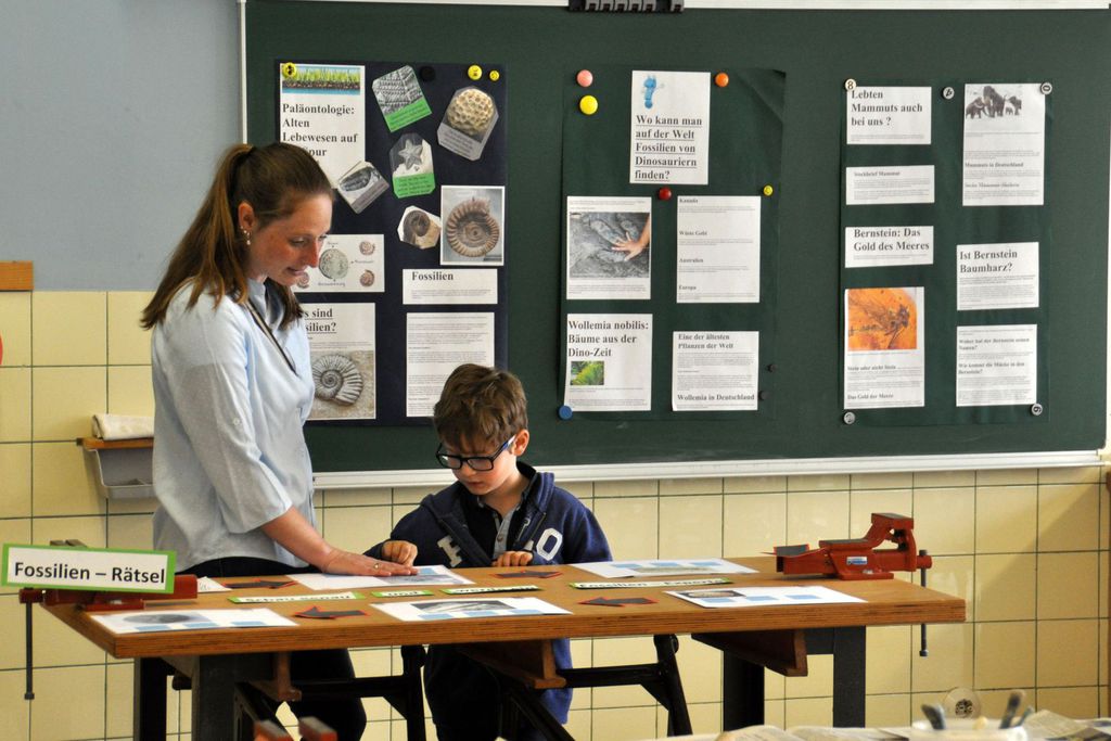 Am Mittwoch, den 18. April erlebte die Klasse 3a zusammen mit ihren Lehrern Tobias Lösch und Nicole Achter eine spannende Zeitreise in die Welt der Fossilien. Frau Sandmeyer-Haus vom Gymnasium Wiesentheid war mit drei Tutoren in die Grundschule Kleinlangheim gekommen, um im Rahmen des HSU Unterrichts und passend zum Jahresthema „Geschichte bewegt“, über die Entstehung von Fossilien zu informieren und mit den Kindern eigene „Gips-Fossilien“ herzustellen. Die Schülerinnen und Schüler konnten die unterschiedlichsten Versteinerungen von Gräsern, Muscheln, Schnecken und Ammoniten bewundern, bevor sie selbst tätig wurden.