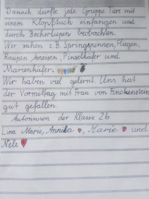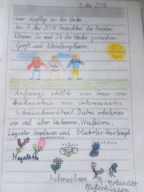 Die Zweitklässler erforschten die Heckenpflanzen und ihre Bewohner, imitierten Stimmen, beschäftigten sich mit Nestbau und der Bedeutung der Hecke für Mensch und Tier.