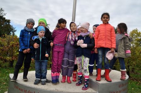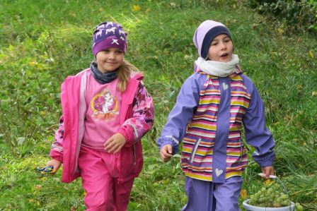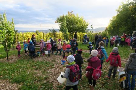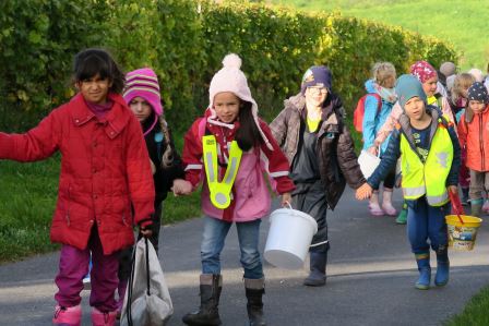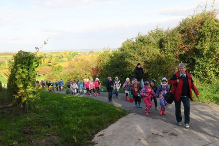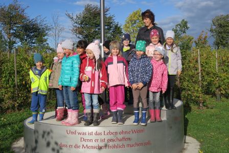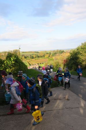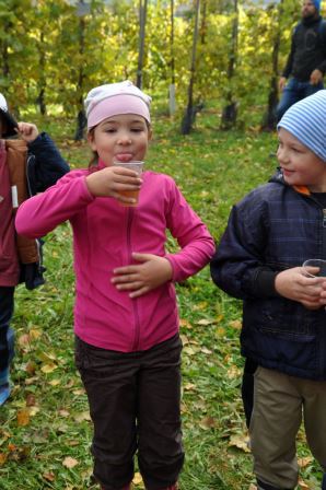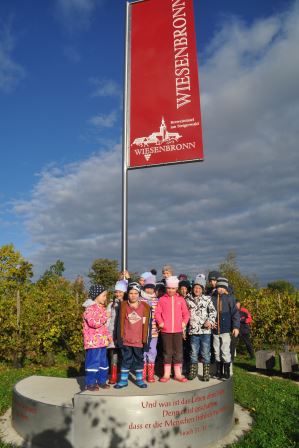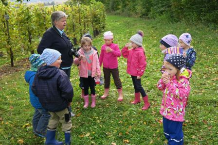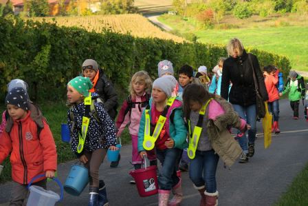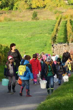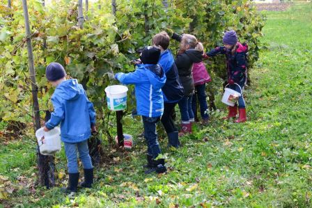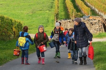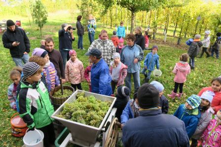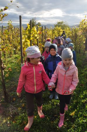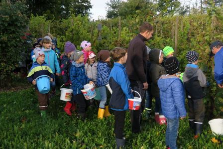 Das Wetter meinte es gut mit unseren Erst- und Zweitklässlern, als sie sich gemeinsam mit ihren Lehrerinnen mit wetterfester Kleidung, Eimerchen und Gartenschere auf den Weg in die Wiesenbronner Weinberge machten, um dort bei der Traubenlese mitzuhelfen. Dort hatten Mario und Andrea Hofmann sowie Willi Gebert mit seiner Frau Maria bereits alles perfekt für die Kinder vorbereitet: Traubenmühle und Kelter waren bereits aufgebaut, heißer Tee und leckerer Kuchen standen für die kleinen Lesehelfer schon bereit. Auch manche weitere Eltern waren gekommen, um die Kinder zu begleiten und ihnen mit Rat und Tat (und evtl. Pflastern) zur Seite zu stehen.