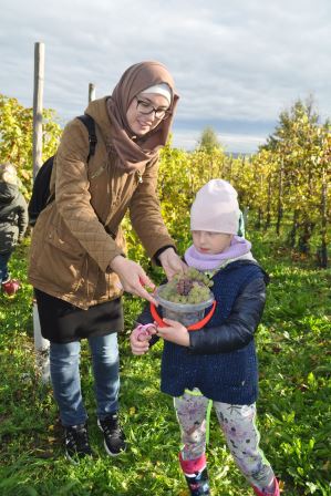 Die 2b machte sich im Oktober auf zur Weinlese am Schwanberg mit Unterstützung der örtlichen Winzerfamilien Roth und Grebner, presste ihren eigenen Traubensaft und erfuhr im Betrieb des Weinguts Roth viel Wissenswertes über Weinanbau, Ernte und Weinherstellung.