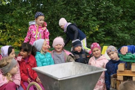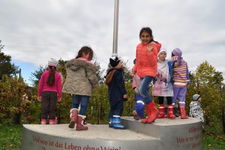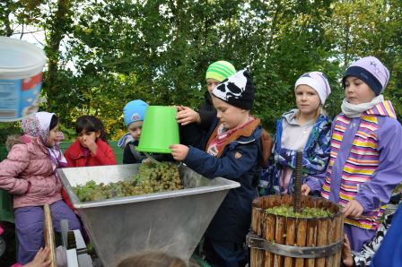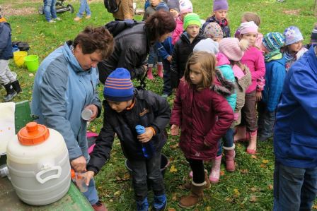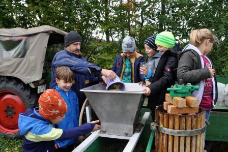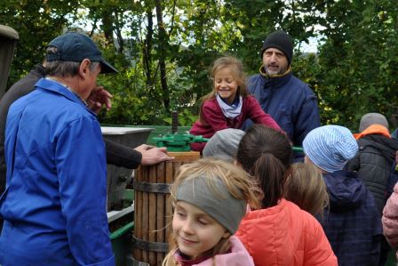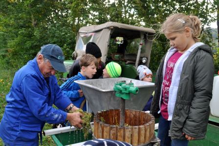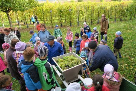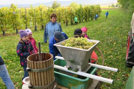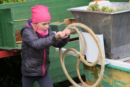 Vor Ort erlebten die Kinder hautnah, wie es bei der Weinlese in früheren Zeiten ganz ohne Strom und ausgereifter Technik zuging: Zunächst wurden die Trauben in der Mühle von Zweiglein und Stielen befreit, was im Handbetrieb ganz schön anstrengend war. Dann wurde mit vereinten Kräften in der Kelter der Saft herausgepresst. Er schmeckte wunderbar!