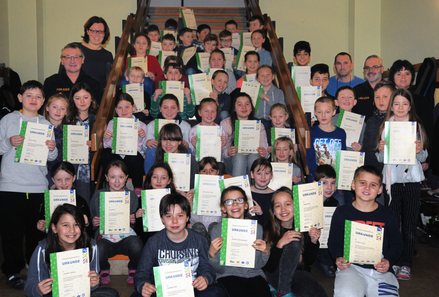 Erfolgreich legten die Schüler der beiden 4. Klassen der Kleinlangheimer Grundschule ihre Fahrradprüfung ab. Zu diesem Zweck wurden sie seit Mitte November von ihren Klassenlehrern Ingrid Wagenhäuser und Manfred Halbritter auf die theoretische Prüfung vorbereitet. Parallel dazu fanden einmal in der Woche in der Turnhalle praktische Übungen statt, in denen die Verkehrspolizisten PHK Saugel und POK Müller den Schülern die Verkehrsregeln und den Umgang mit dem Fahrrad näher brachten. Hier konnten die Schüler ihr neu erworbenes theoretisches Wissen sofort in der Praxis erproben. Nachdem theoretische und praktische Prüfung am 6. Dezember bestandenen waren, durften die Schüler im Realverkehr ihr Können bei einer Fahrt durch ihren Heimatort zeigen. Hierbei wurden die Kinderfahrräder auf ihre Verkehrssicherheit überprüft. Als krönenden Abschluss bekamen sie am 15. Dezember ihre Wimpel und Urkunden überreicht.